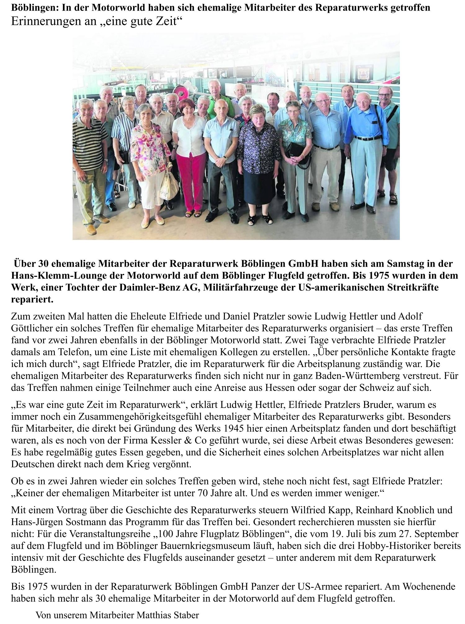 Nach der weiteren Auswertung dieses Materials trafen sich am 20.Juli 2013 ca. 30 ehemalige Mitarbeiter des Reparaturwerks Böblingen in der Klemm-Lounge von „Motorworld“, dort, wo vor über 30 Jahren ein Großteil gearbeitet hat. Die AG Böblinger Flughafengeschichten präsentierte den Anwesenden einen kleinen Überblick über den ehemaligen Böblinger Flughafen und eine Auswahl der erhaltenen Fotos. Anschließend stellte man sich zu einem gemeinsamen Gruppenfoto. Die Kreiszeitung Böblinger Bote berichtete darüber: