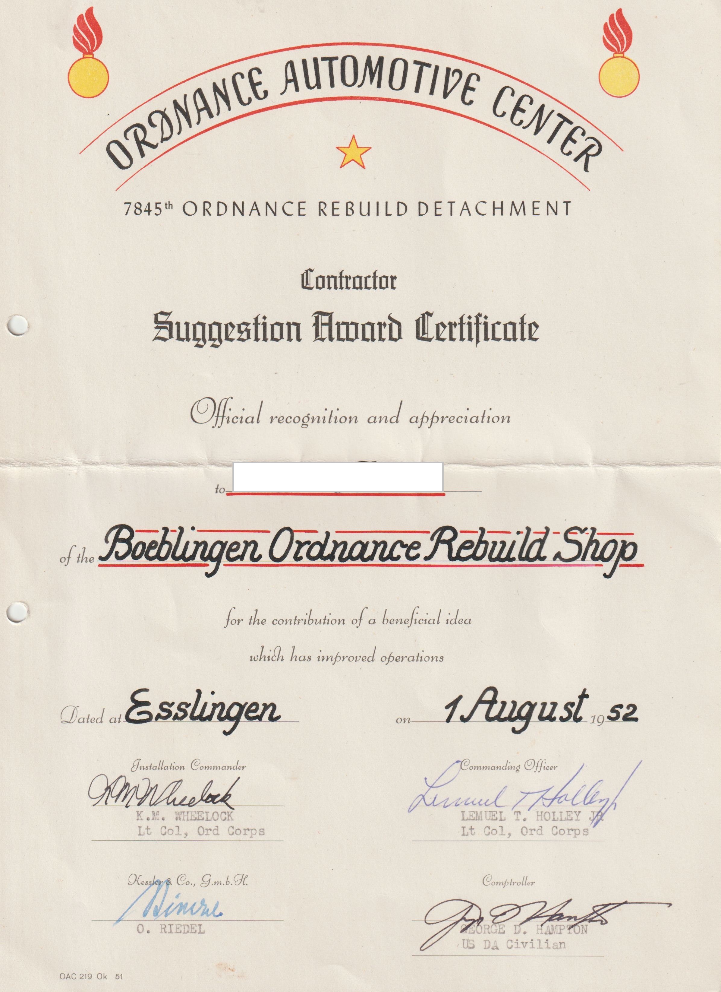 Ergänzend zu den bisherigen Ausführungen: Von Juli 1945 bis Mai 1948 stand der Tätigkeitsbereich unter der Kontrolle verschiedener Ordnance-Bataillons. Das erste dieser Art war das 178.th Ord.Bn. unter der 60.th Ord.Group; mit der 514.th Ord HM(FA) und der 874.th Ord.HAM Co. in Böblinger Einsatz, unterstützt durch die Hinzufügung der 423.rd Ord.EVAC Co. im November 1946. Im Januar 1947 wurde das 178.th Ord.Bn. durch das 85.th Ord.Bn., und das 138.th Ord.HM(FA) Co, ersetzte die 423.rd Ord.EVAC Co. Zur gleichen Zeit wurde die 83.th Ord. General Supply Det. mobilisiert, die Sammelstelle in Betrieb zu nehmen.