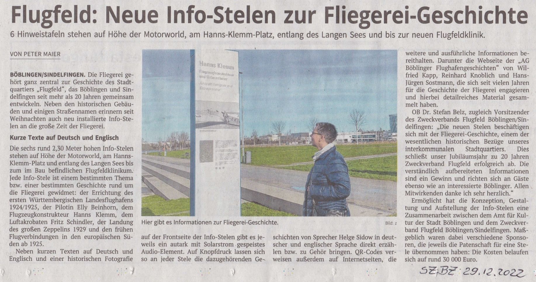 Die Fliegerei gehört ganz zentral zur Geschichte des heutigen Stadtquartiers „Flugfeld“, das die Städte Böblingen und Sindelfingen seit mehr als 20 Jahren gemeinsam entwickeln. Neben den noch vorhandenen historischen Gebäuden und einigen Straßennamen erinnern nun auch neu installierte Info-Stelen an die große Zeit der Fliegerei.