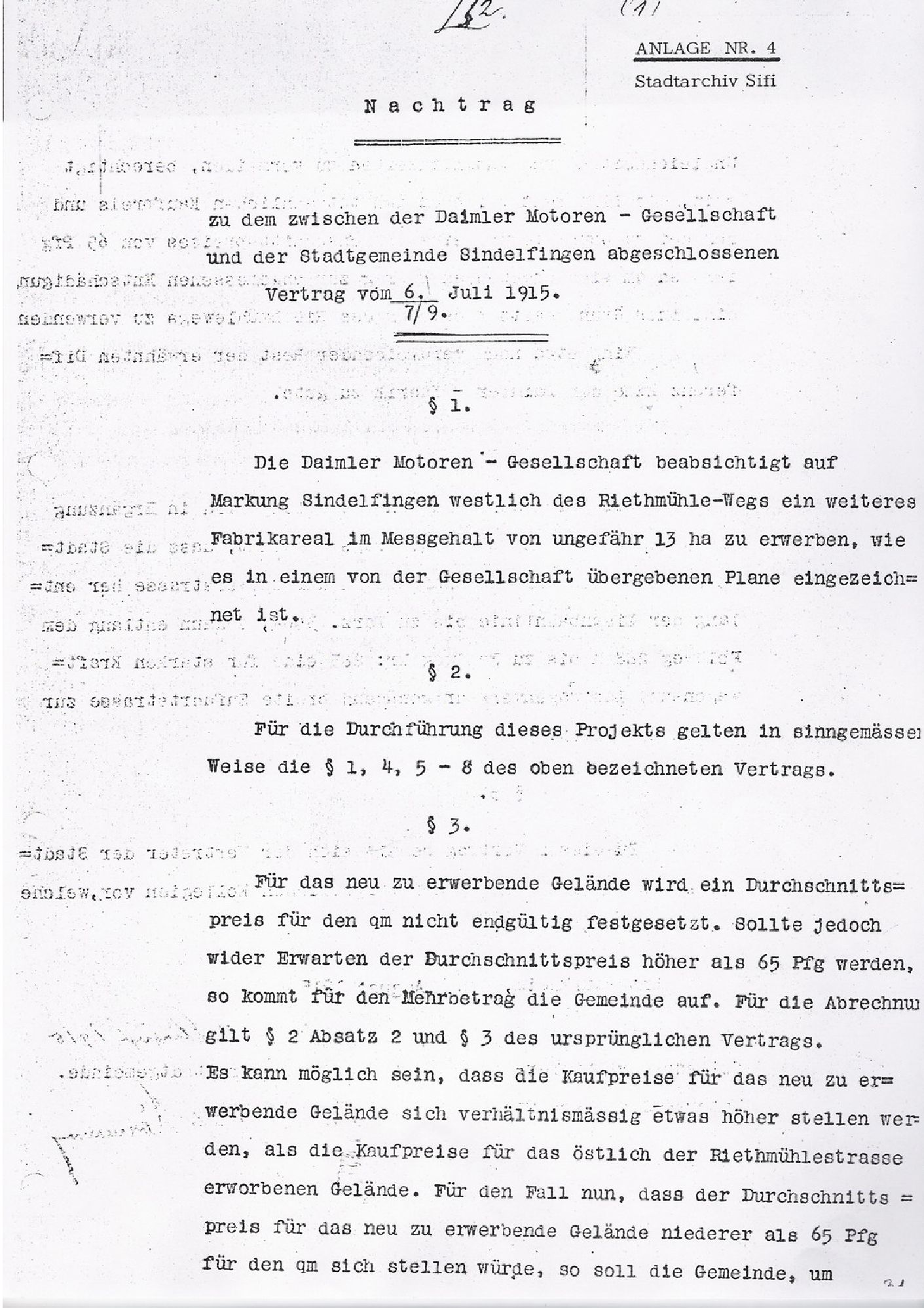 Dieser Vertrag kennzeichnete das von der DMG zu erwerbende Gelände, das in unmittelbarem Anschluss an den Flugplatz im Süden durch den Lauf der Schwippe und des Mühlbachs (Riedmühlekanal) , im Osten durch die heutige Tübinger Allee, im Norden durch das Areal der Eisenbahn und im Westen durch den zur Riedmühle führenden Weg begrenzt sein sollte. Die Stadt musste sich verpflichten, die Grundstücksaufkäufe nach Kräften zu unterstützen und einen Durchschnittspreis von max. 38 Pfennigen pro qm garantieren. Die Gas- und Wasserleitungen sollten zulasten der Stadt gehen, die auch die beiden Zufahrtsstraßen zum Werk von der Tübinger Allee und vom Bahnhof her auf ihre Kosten bauen und beleuchten musste. Schließlich hatte sich die Stadt noch zu verpflichten, auf die Dauer von 10 Jahren, vom 01. April 1916 an gerechnet, höchsten 6 Prozent der Gemeinde-Steuer-Ertragskataster von der DMG zu erheben. Das Datum ist insofern interessant, als es den Zeitpunkt angibt, zu welchem das Werk mit der Aufnahme der Produktion in Sindelfingen rechnete. Am 06. Juli 1915 wurde der Vertrag von den Direktoren Berge und Baurat Paul Daimler – übrigens der älteste von fünf Gotlieb Daimler-Kindern – für die DMG und einen Tag später von Stadtschultheiß Hörmann für die Stadt Sindelfingen unterzeichnet, der aber nur vorbehaltlich der Zustimmung des Gemeinderats. (Mercedes-Benz Chronik)
