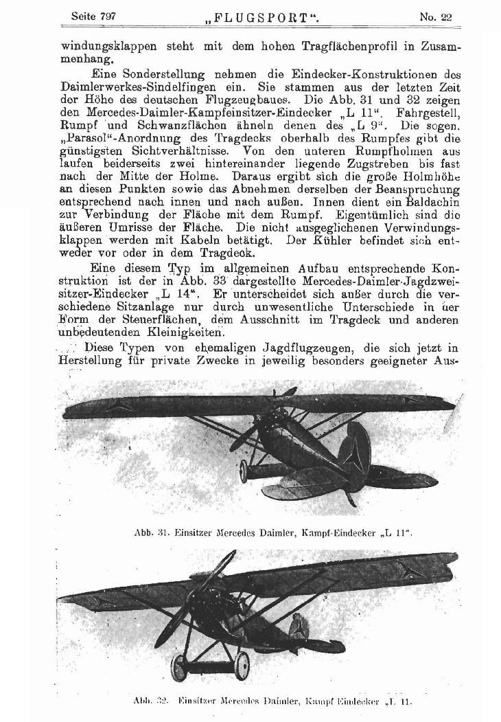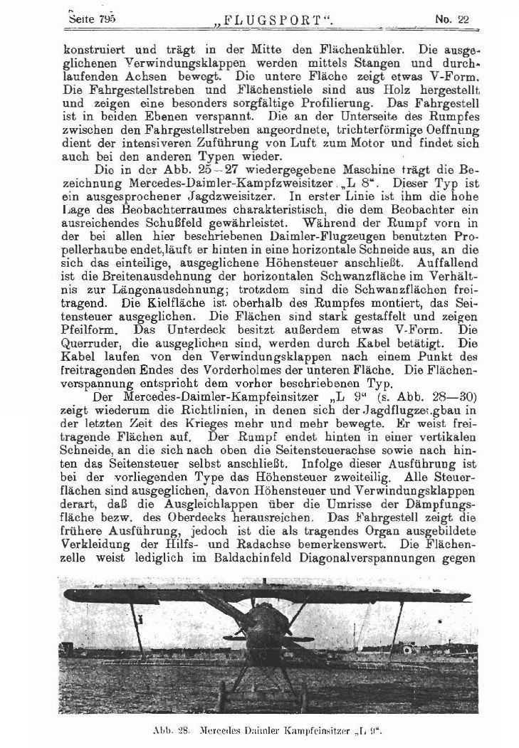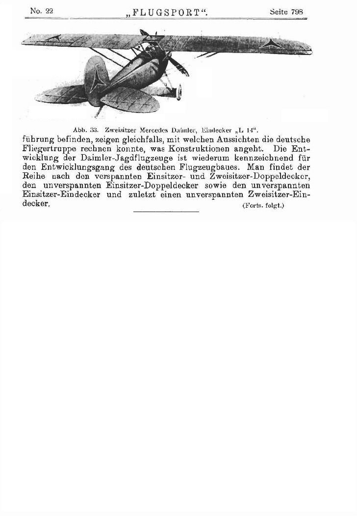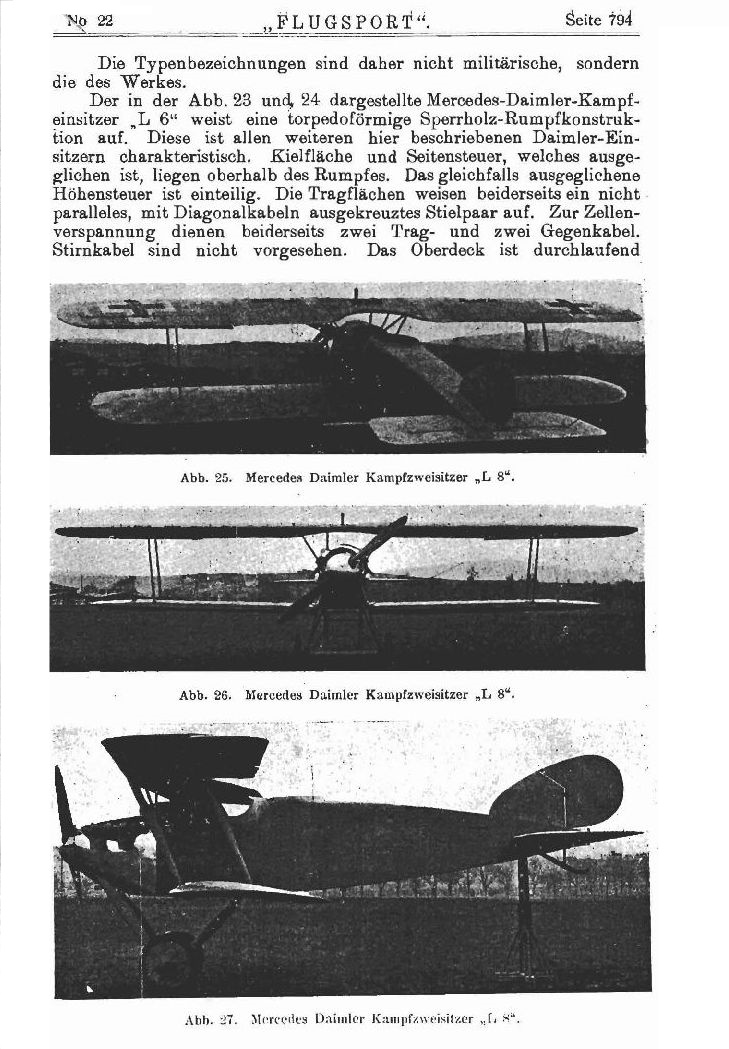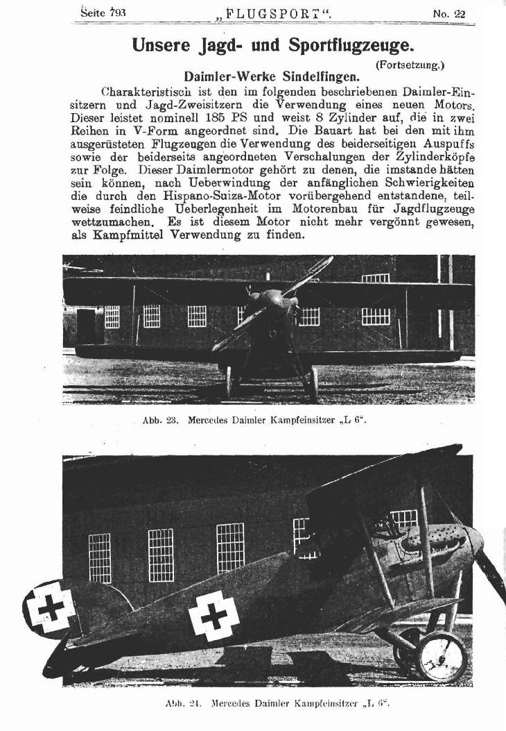 1917 begann diese Flugzeugabteilung mit der Arbeit an einem originalen einsitzigen Jäger nach dem Entwurf von Ing. Karl Schopper, der vom neuen wassergekühlten D IIIb-Achtzylindermotor des Unternehmens angetrieben wurde. Der Flugtest dieses L 6 (oder DI) -Einzelspannungs-Doppeldeckers mit zwei Feldern wurde aufgrund von Motorlagerproblemen bis Ende November 1917 verzögert. Die Schwere des Schwanzes wurde durch Änderung der Anordnung der Flügelzellen behoben, die Flugtests wurden im März 1918 abgeschlossen, und der L 6 wurde im Juli nach Tylerrufung nach Adlershof geschickt, wo er gleichzeitig am zweiten D-Typ-Wettbewerb teilnahm. Die Leistung litt unter der Tatsache, dass der D-Federmotor mit einer Leistung von 185 PS in der Höhe an Leistung verlor. Am 23. Juli 1918 wurde jedoch ein Auftrag über 20 Exemplare des Daimler-Jägers vergeben. Diese Flugzeuge, die mit synchronisierten 7,92-mm-LMG 08/15-Maschinengewehren bewaffnet waren, wurden im Dezember 1918 ausgeliefert.