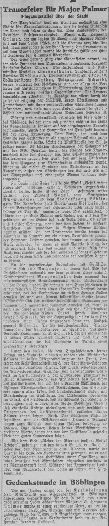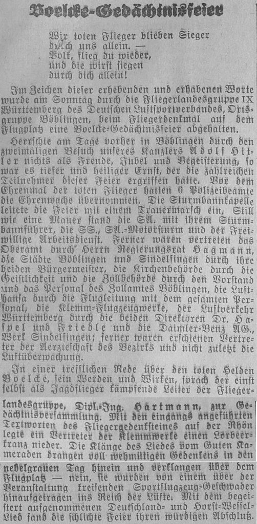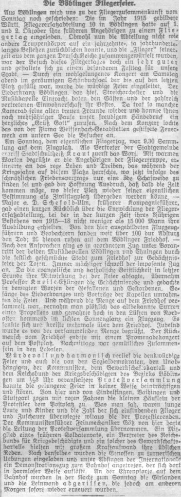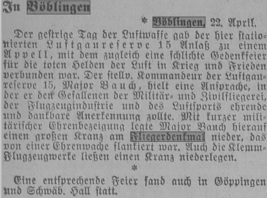 Die bürgerlichen Kollegien wurden in Militärautos auf dem Flugplatz abgeholt. Dort begrüßte Stadtschultheiß Dingler in einer Ansprache die anwesenden Offiziere und überreichte jedem von Ihnen als Angebinde der Stadt einen silbernen Becher. Darauf erwiderte Hauptmann von Beers dankend und brachte ein Hoch auf die Stadt Böblingen aus, das von den zahlreichen Anwesenden begeistert aufgenommen wurde, Böblingen ist nun zur Garnisonsstadt geworden.