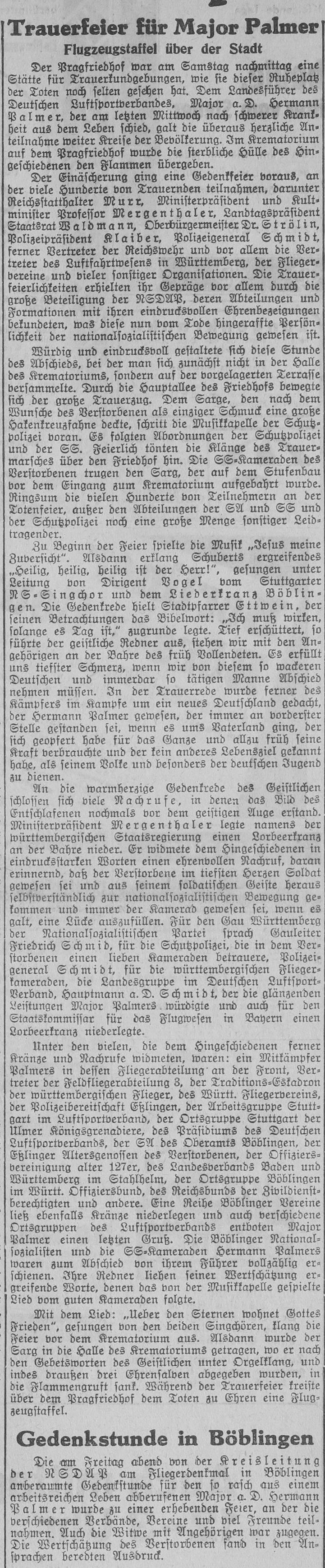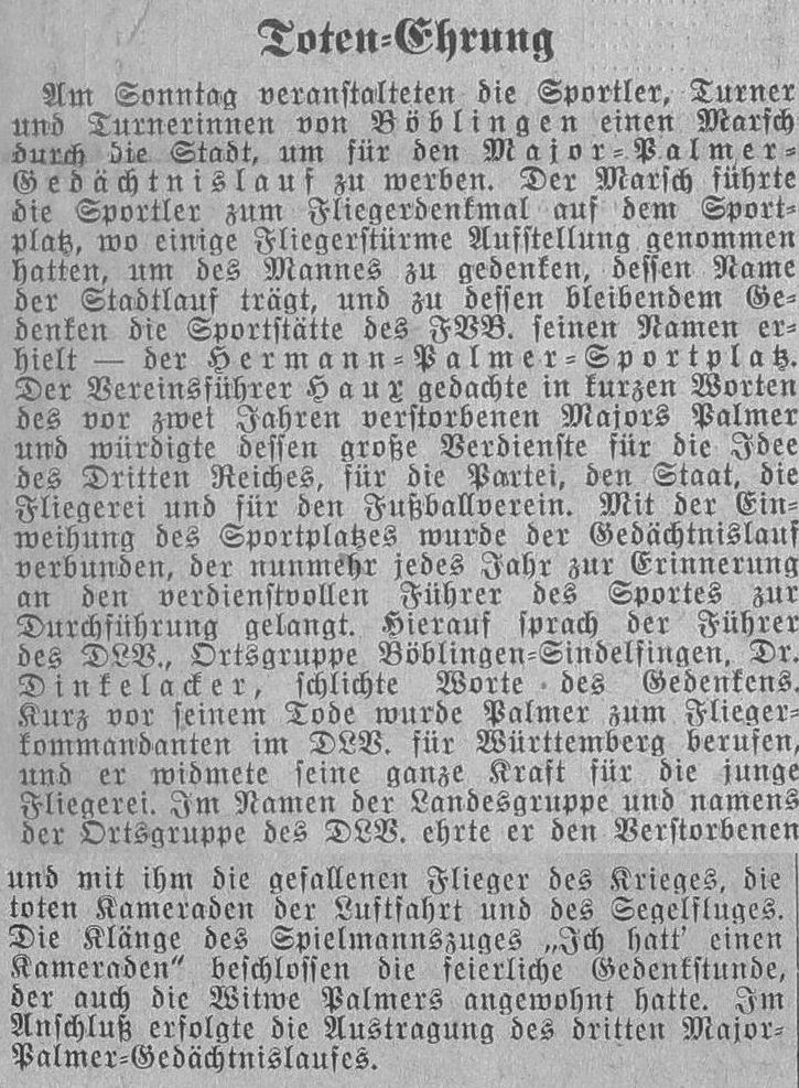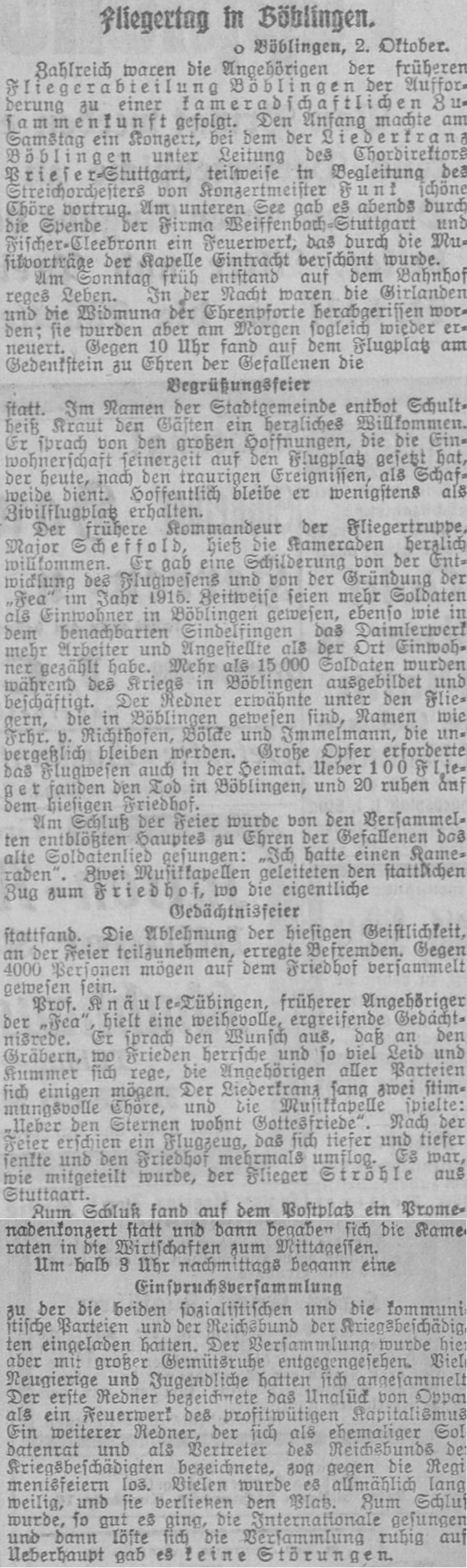 Die bürgerlichen Kollegien wurden in Militärautos auf dem Flugplatz abgeholt. Dort begrüßte Stadtschultheiß Dingler in einer Ansprache die anwesenden Offiziere und überreichte jedem von Ihnen als Angebinde der Stadt einen silbernen Becher. Darauf erwiderte Hauptmann von Beers dankend und brachte ein Hoch auf die Stadt Böblingen aus, das von den zahlreichen Anwesenden begeistert aufgenommen wurde, Böblingen ist nun zur Garnisonsstadt geworden.