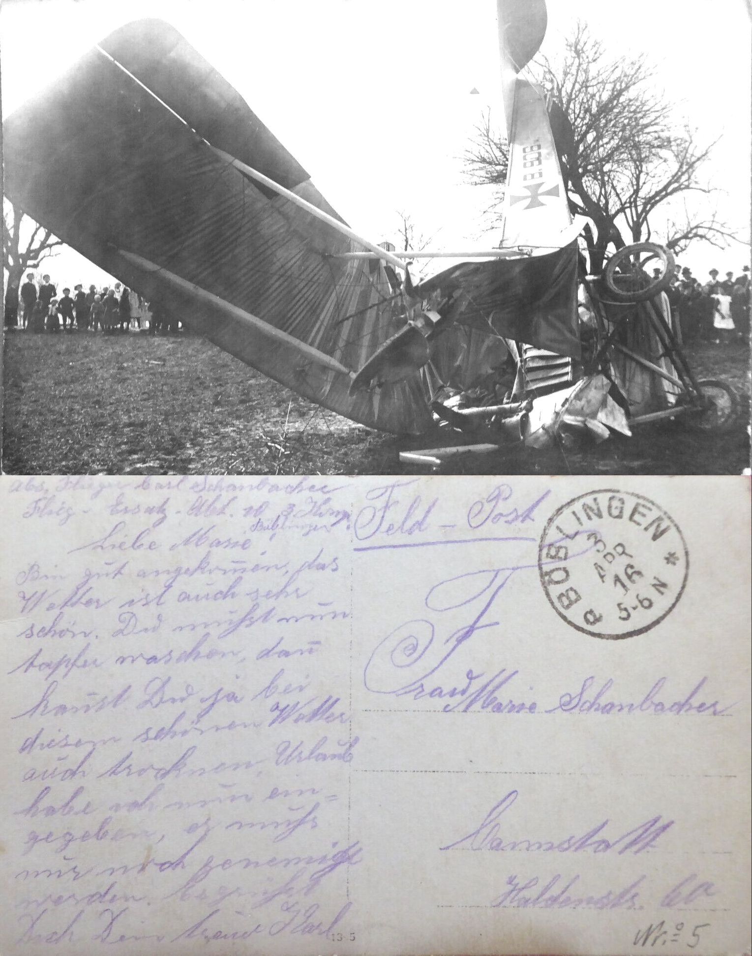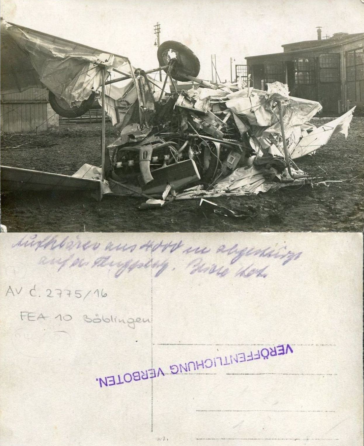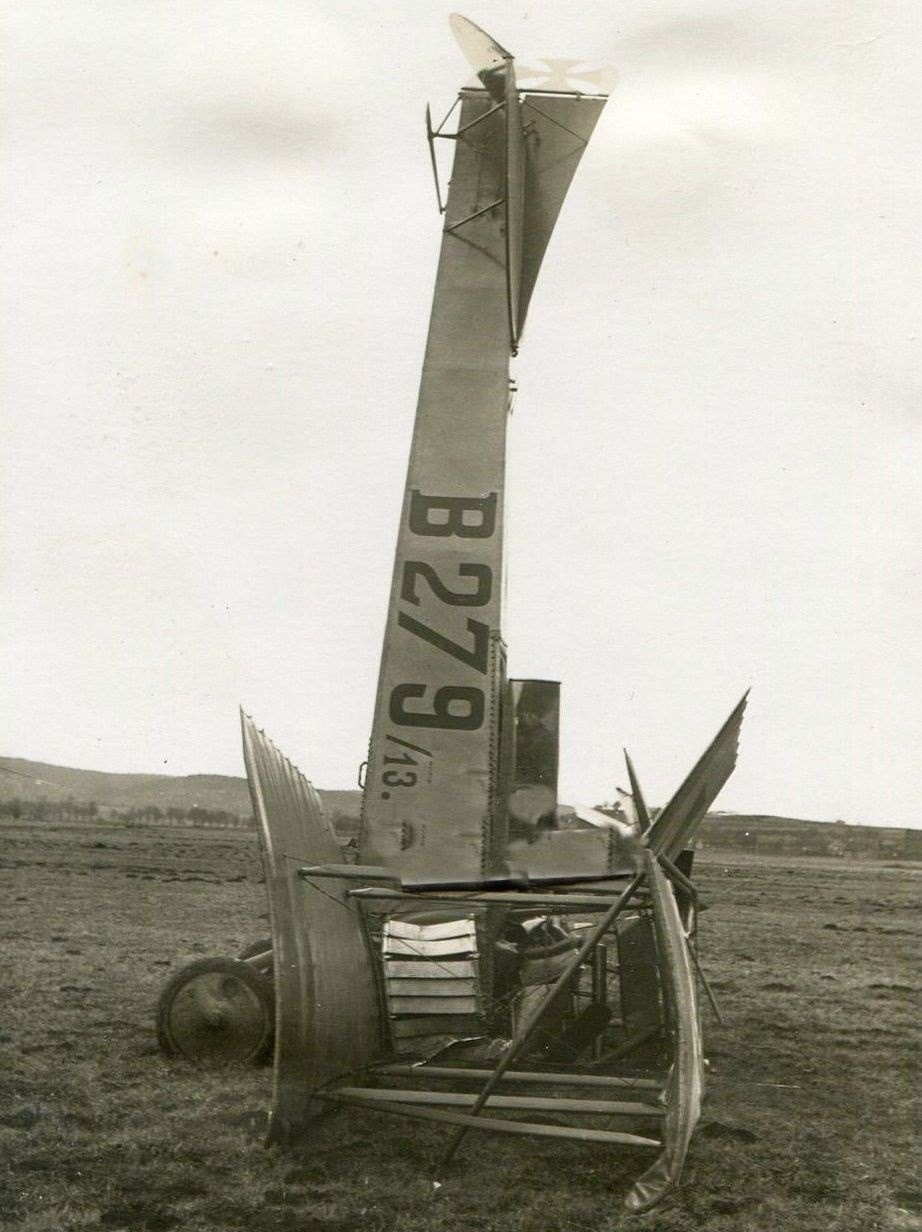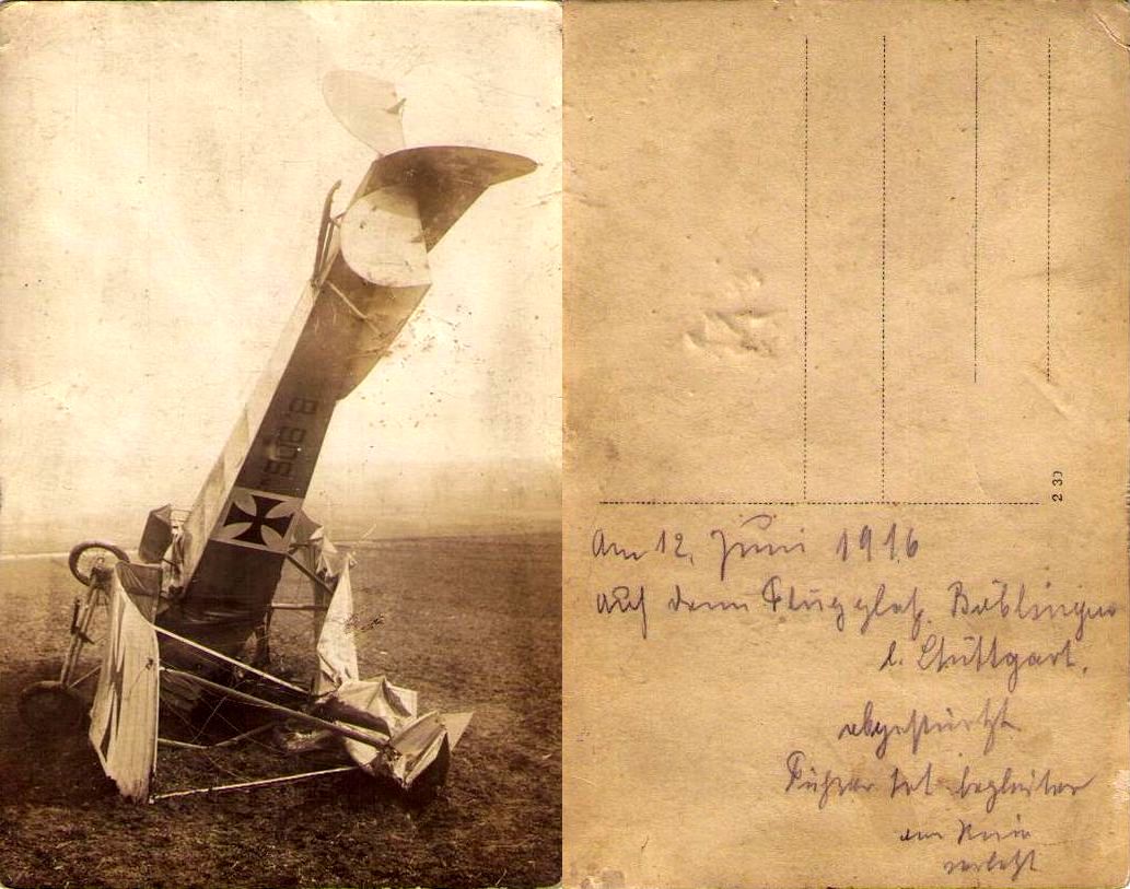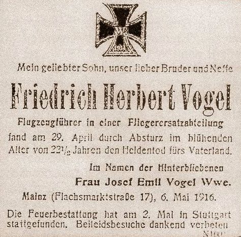 1916-04-29 Fsch Gefr. Friedrich Herbert Vogel *13.10.1893 in Mainz (Hessen), stürzte mit Aviatik B.II 1338/15 am Bahndamm Böblingen-Vaihingen aus unbekannter Ursache tödlich ab.