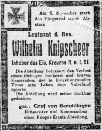 1918-11-06 Dei Besatzung Fsch Gefr. Franz Weber *19.06.1896 in Freiburg (Baden), und Bsch. Lt.d.R. Wilhelm Knippscheer *31.01.1894 in Duisburg (Rheinprovinz), kamen bei einem Sturzflug mit DFW C.V 6015/17 in Sindelfingen ums Leben.