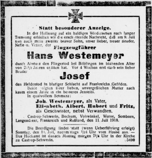 1918-07-09 Fsch. Johannes Westemeyer *05.02.1897 in Bochum (Westfalen), stürzte mit Rumpler C.I (Mark) 2696/17 um 10.32 Uhr aus unbekannten Gründen an der Straße Böblingen-Dagersheim tödlich ab.