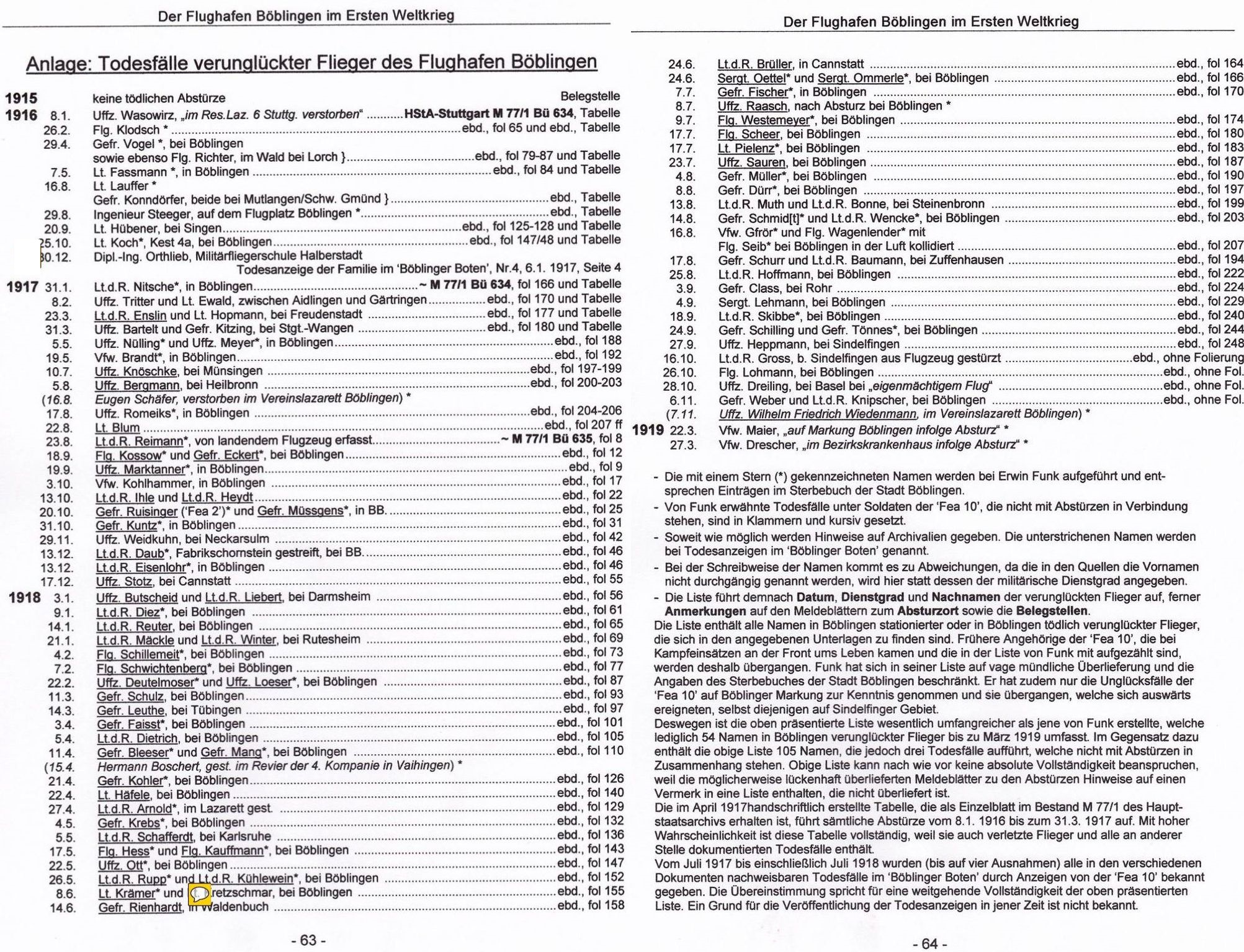 1917-01-31 Die Besatzung Fsch Vzfw. Max Nitsche *09.01.1892 in Rauschwalde (Schlesien), und Flg. Wilhelm Braun *23.10.1893 in Bissingen (Württ) ist mit Euler B.I 419/14 nach einer Kurve in niederer Höhe am Flugplatz Böblingen abgestürzt. Nitsche starb sofort, Braun starb am 04.02.1917 an den Unfallfolgen. (Quelle HstA-Stuttgart M77/1 Bü 634)