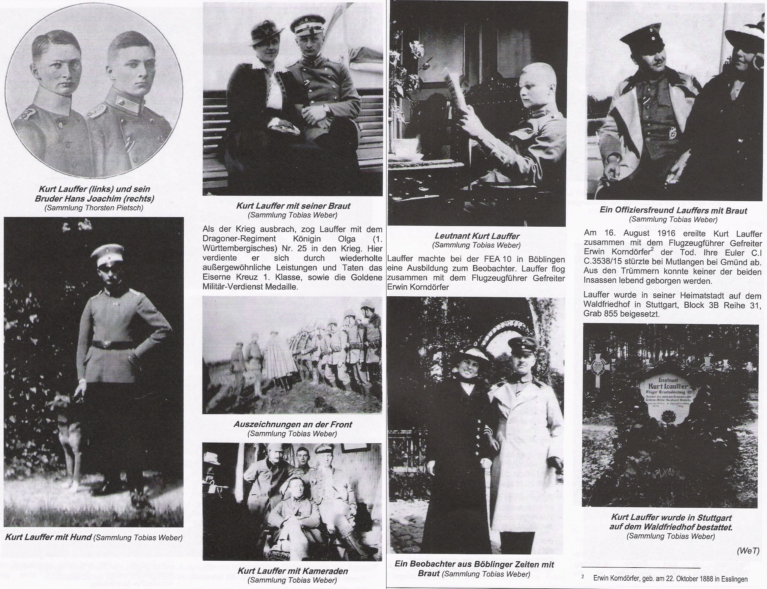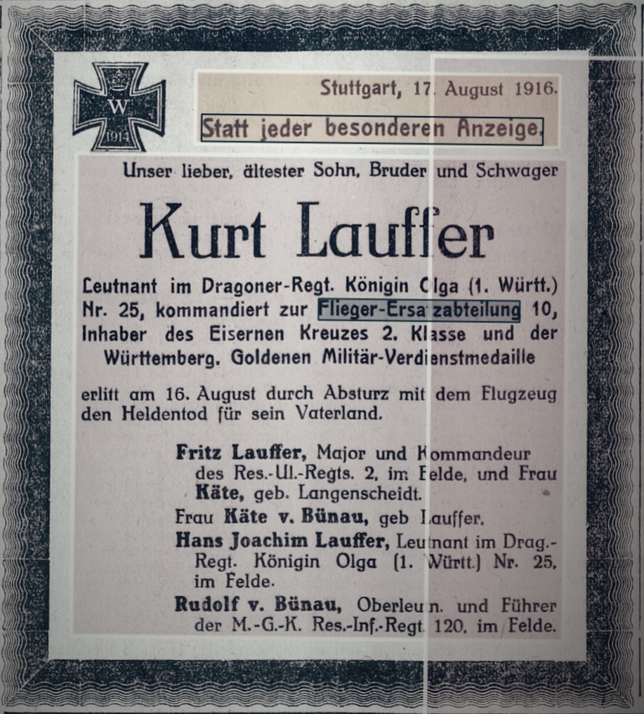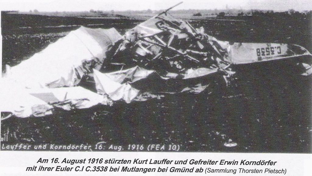1916-08-16 Die Besatzung Fsch Gefr. Erwin Korndörfer *22.10.1888 Esslingen (Württ) und B Lt. Kurt Lauffer *04.11.1894 in Stuttgart, stürzte mit Euler C.I 3538/15 (umgebaute LVG) auf der Mutlanger Heide bei Gmünd aus 2600 m Höhe tödlich ab. Ursache unbekannt. Lauffer wurde auf dem Waldfriedhof Stuttgart Block 3B, Reihe 31, Grab 855, beigesetzt.