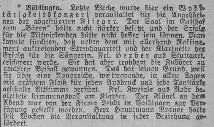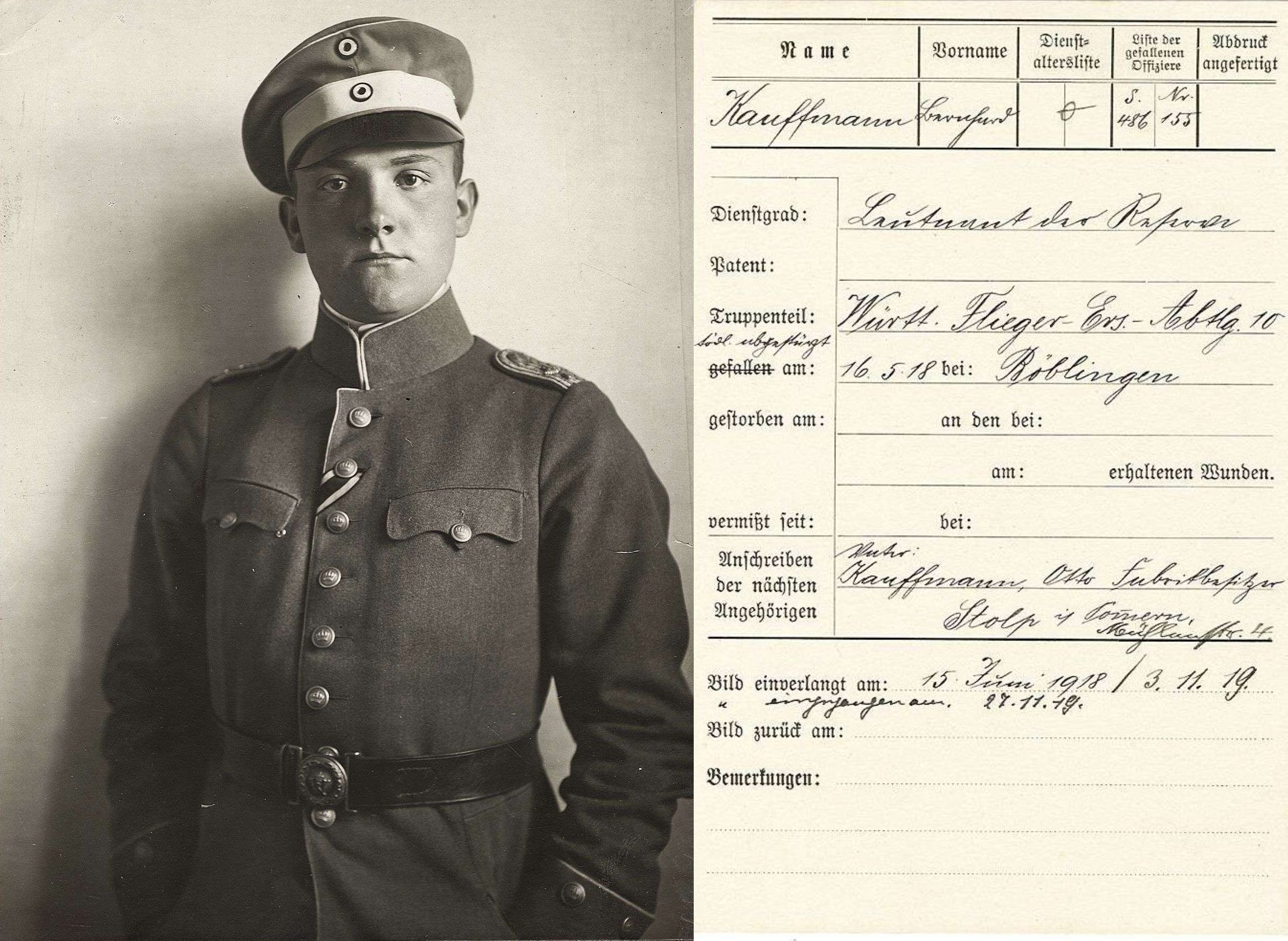1918-04-20 Fsch Gefr. Karl Kohler *01.02.1895 in Göppingen (Württ) ist mit Albatros B.II (Kon) 415/16 um 18.02 Uhr nördlich vom Bahnhof Böblingen durch Abrutschen aus 800 m Höhe abgestürzt, um 19.45 Uhr ist Kohler an seinen Verletzungen verstorben.