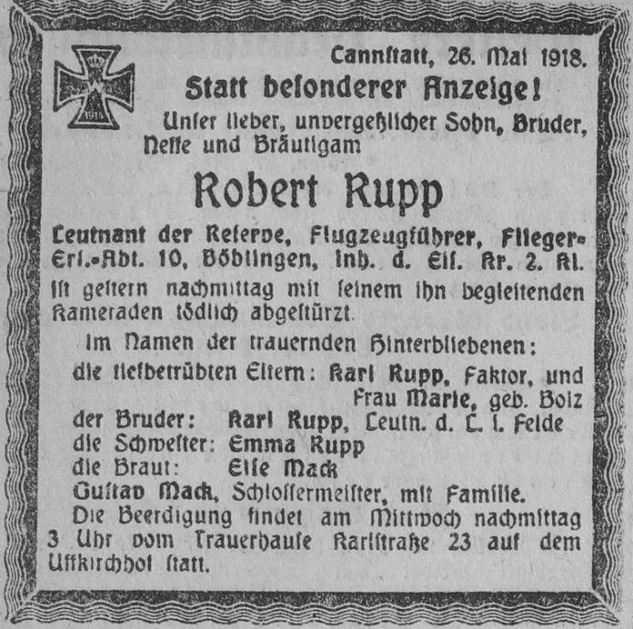 1918-05-15 Flg. Friedrich Hutzenlaub *02.07.1892 in Cannstatt (Württ), ist in Böblingen abgestürzt, starb am nächsten Tag und wurde auf dem Alten Fellbacher Friedhof beigesetzt.