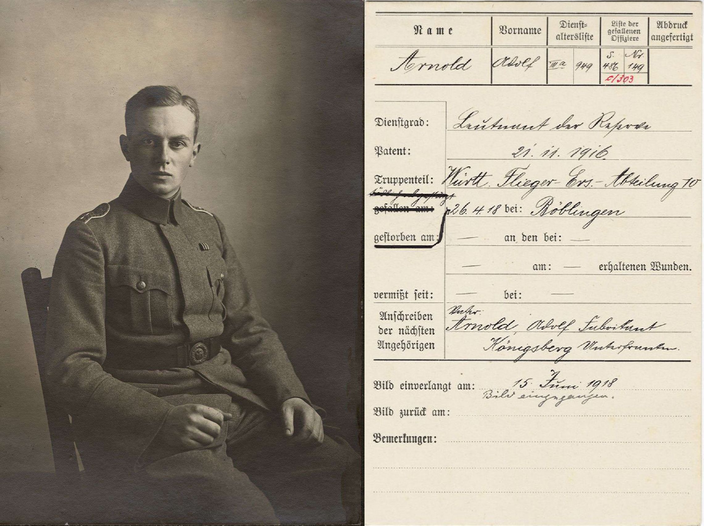 1918-04-26 Fsch Lt.d.R. Adolf Arnold *08,04.1894 in Könisgberg (Herzogtum Sachsen-Coburg-Gotha), ist mit Rumpler (Mark) C.I 2694/17 in ener Linkskurve abgestürzt, wurde verletzt ins Bezirkskrankenhaus Böblingen gebracht, wo er am nächsten Tag u 13.00 Uhr starb.