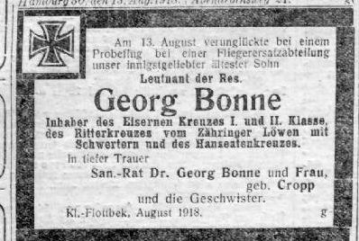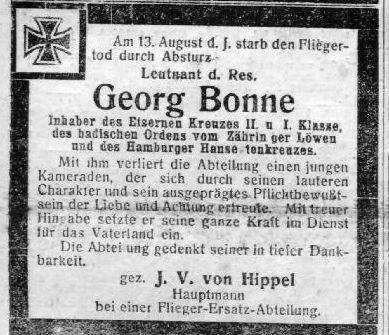 1918-08-13 Die Besatzung Fsch Lt.d.R. Peter Muth *04.08.1896 in Stephanshauesen (Hessen-Nassau), und Bsch Lt.d.R. Georg Bonne *11.05..1889 in Nienstedten (Scheswig-Holstein), überzogen um 09.00 Uhr ihre DFW C.V 4609/17 und stürzten aus 2000 m Höhe bei Steinenbonn tödlich ab. Bonne wurde in seinen Heimatort überführt.