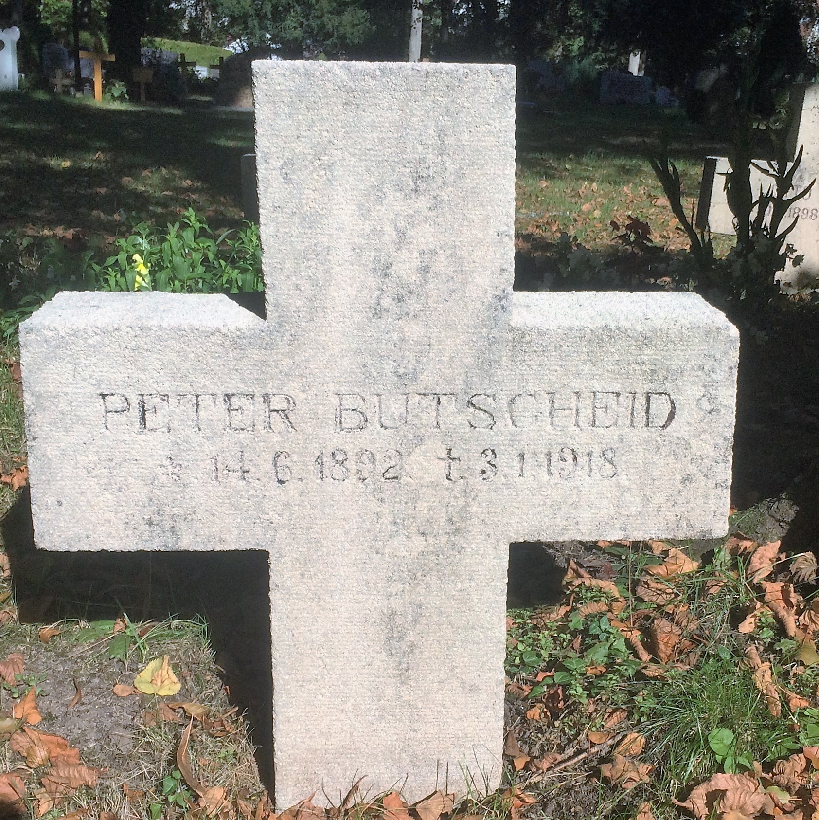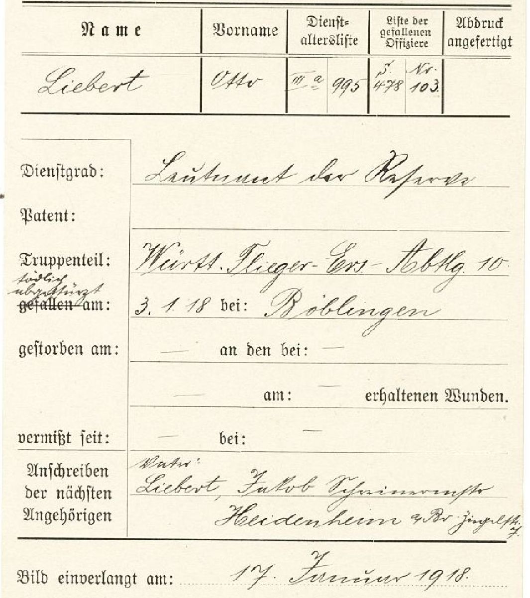 1918-01-03 Die Besatzung Fsch Uffz. Peter Butscheid *14.06.1892 in Mühlheim (Hessen), und dB Lt.d.R. Otto Liebert *10.12.1894 in Nörvenich (Westfalen), sind mit LVG C.II C.773/15 um 14.45 Uhr am Schießplatz Darmsheim bei Böblingen in der Kurve abgerutscht. Beide Insassen waren sofort tot.