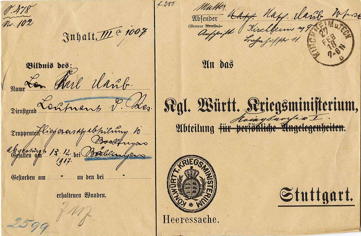 1917-12-16 Fsch Uffz. Theophil Stolz *01.08.1892 in Oberrad (Hessen-Nassau), ist mit Aviatik C.I (Han) 630/16 um 10.00 Uhr abgestürzt und verstarb abends 22.05 Uhr im Krankenhaus Stuttgart-Cannstatt.