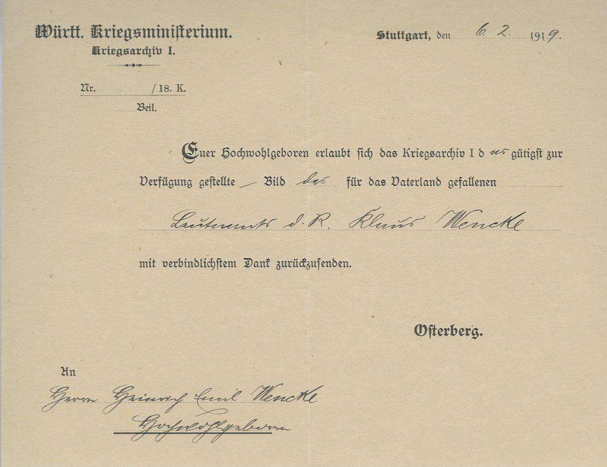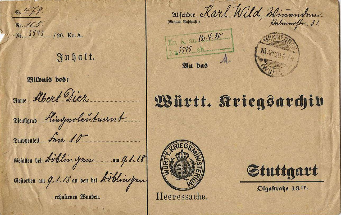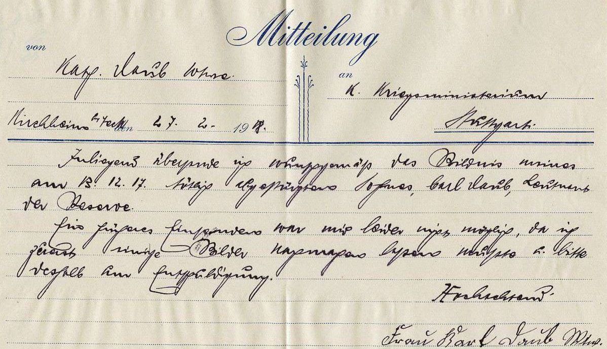 1918-11-07 Uffz. Wilhelm Friedrich Widenmaier *29-09.1886 in Ehningen (Württ), starb im Krankenhaus Böblingen.