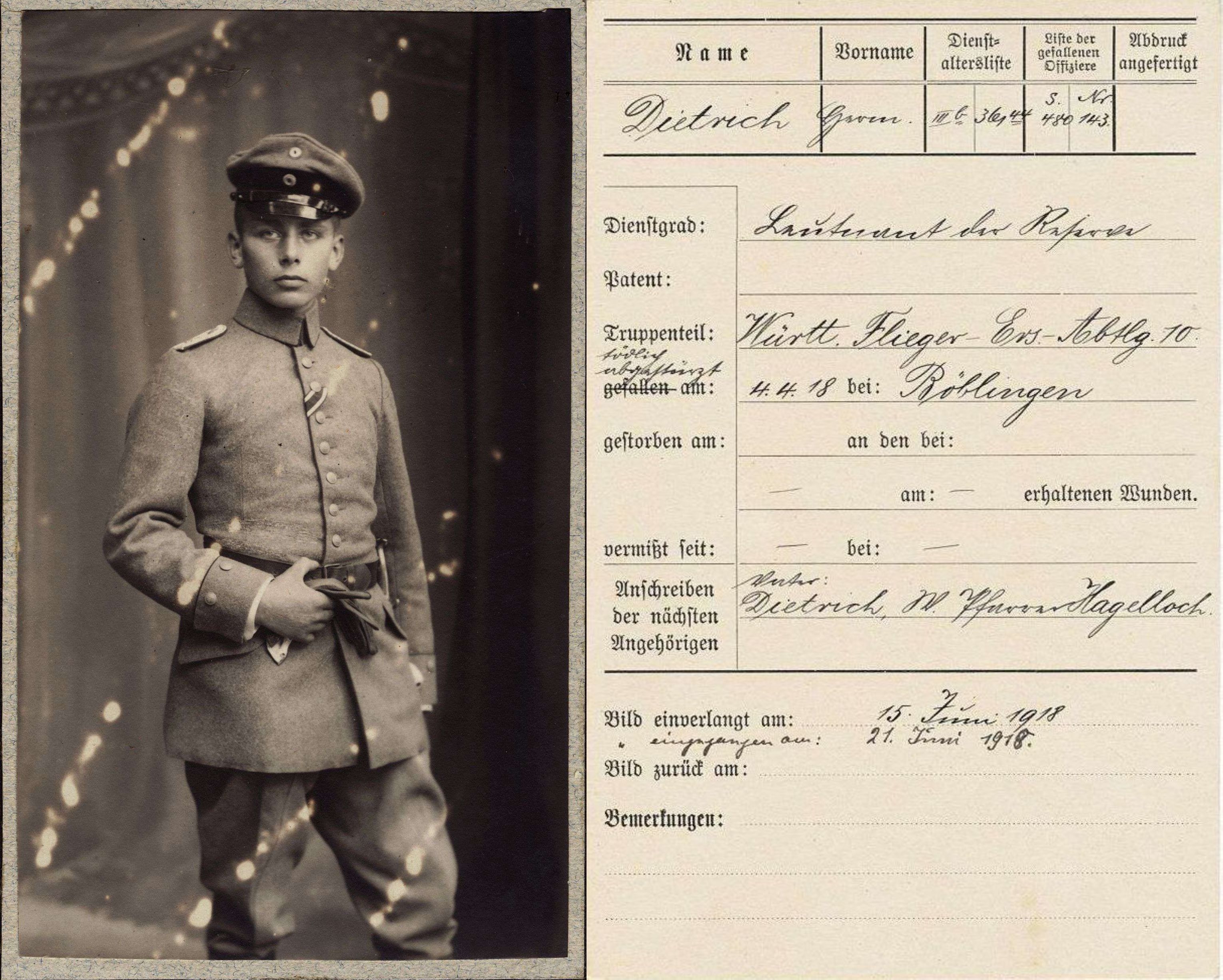 1918-04-04 Fsch Lt.d.R. Hermann Dietrich *22.06.1897 in Hettlingen (Schweiz), ist mit seiner LVG C.II 295/16 um 15.30 Uhr 4 km nordwestlich vom Bahnhof Böblingen durch Überziehen in der Kurve abgestürzt. Sein Leichnam wurde in die Schweiz überführt.
