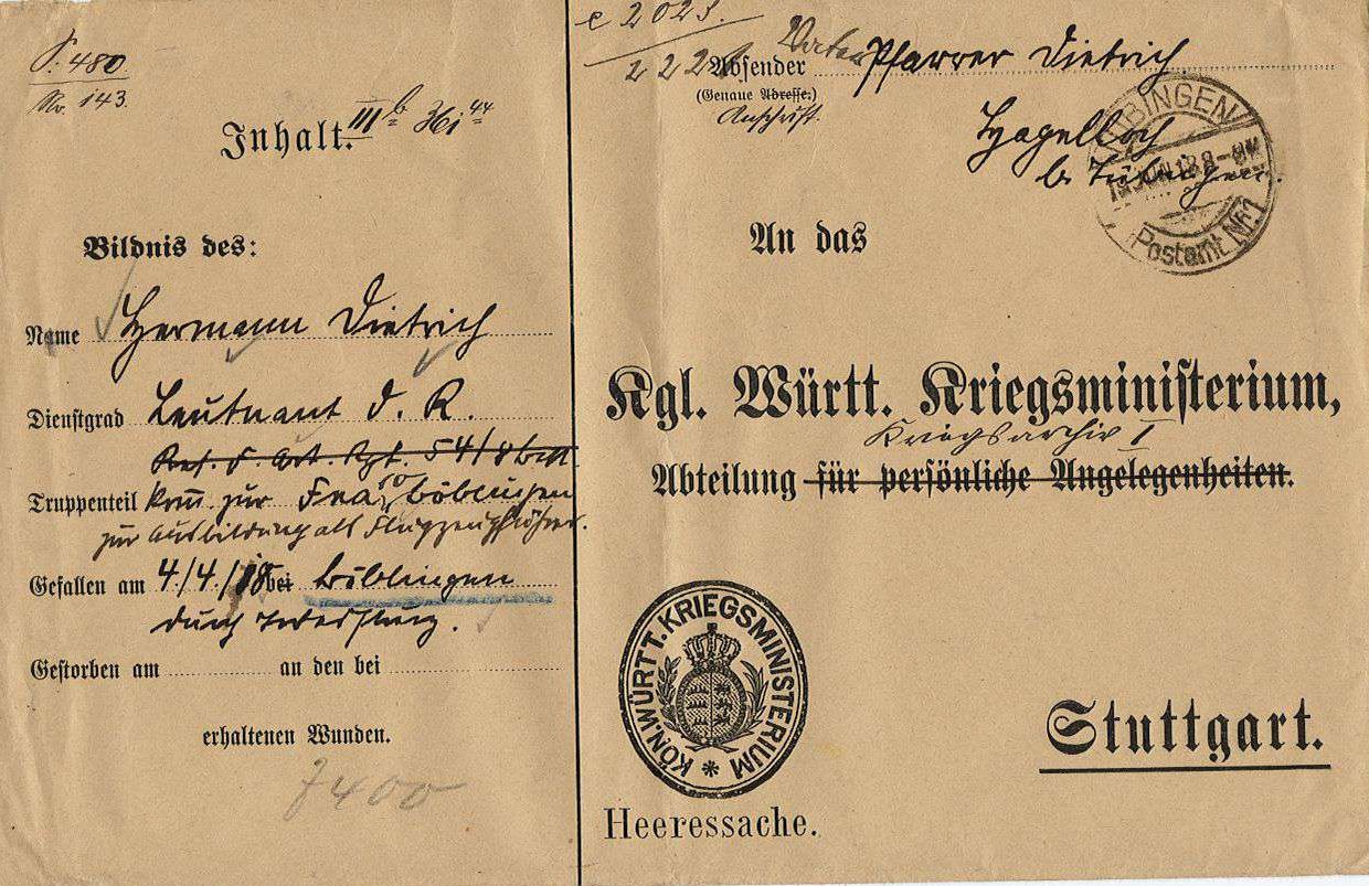 1918-04-25 Flg. Adolf Baitinger *10.11.1890 in Feuerbach (Württ), stirbt im Krankenhaus Stuttgart.