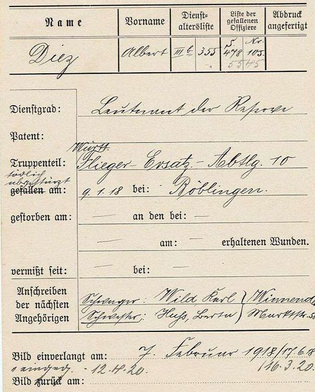 1918-01-09 Fsch Lt.d.R. Albert Diez *18.05.1895 in Stuttgart, ist um 11.01 Uhr wegen zu niedriger geflogener Kurve mit Rumpler C.I (Mark) 2569/17 abgestürzt und war sofort tot.