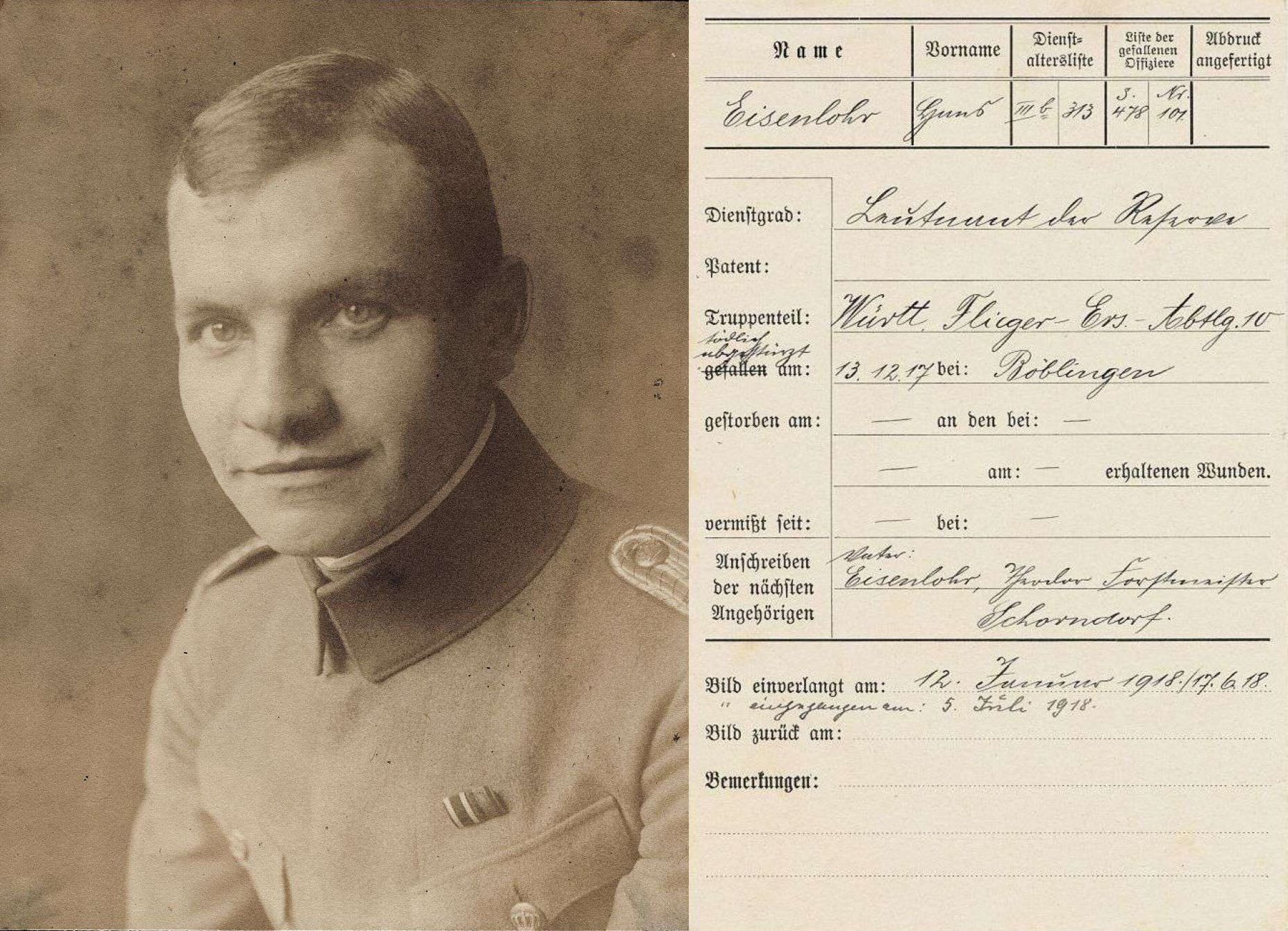 1917-12-13 Fsch Lt.d.R. Hans Eisenlohr *20.06.1894 in Neuenburg (Württ), ist mit Aviatik (Han) 2781/16 um 12.38 Uhr abgestürzt und um 16.00 Uhr im Krankenhaus Böblingen verstorben.