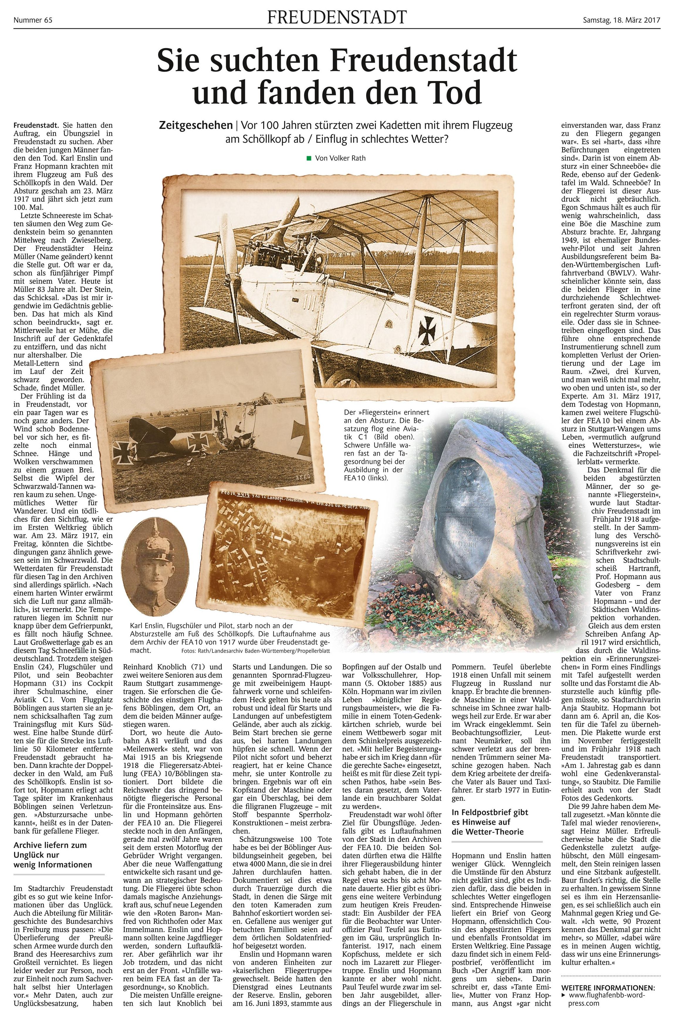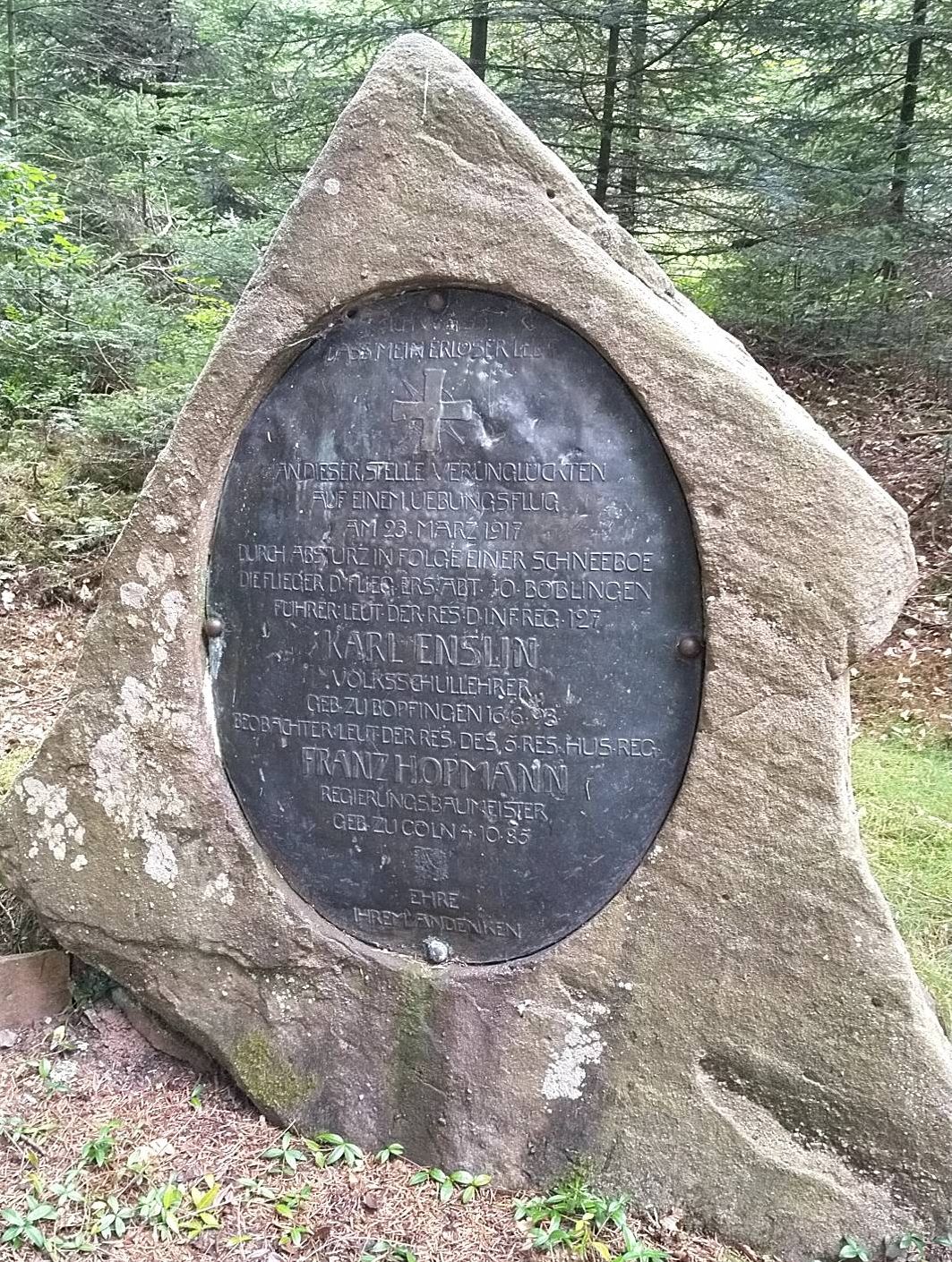 1917-03-23 Die Besatzung Fsch Lt.d.R. Karl Enslin *16.06.1893 in Bopfingen (Württ), und B Lt.d.R. Franz Hopmann *04.10.1895 in Köln (Rheinprovinz), stürzte mit Aviatik C.I 384/15 aus unbekannter Ursache bei Freudenstadt ab. Enslin tot, Hopmann starb am 31. März 1917 im Krankenhaus Böblingen.