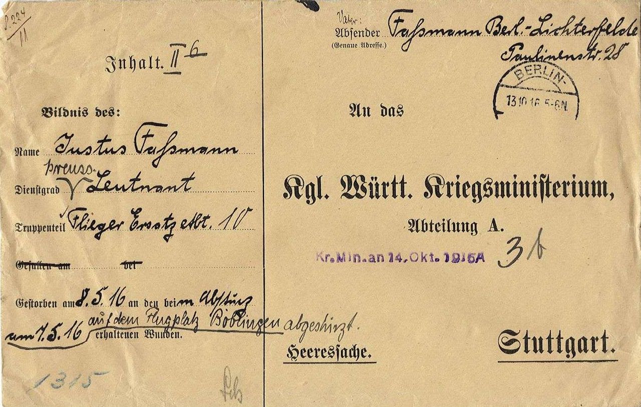 1916-05-07 Die Besatzung Fsch Flg. Brömmer und B Lt.d.R. Justus Faßmann *10.02.1891 in Charlottenburg (Brandenburg), blieb in Böblingen mit Euler B.I 481/15 in den Bäumen hängen und stürzte ab. Faßmann starb am 8.05.1916, Brömmer wurde leicht verletzt.