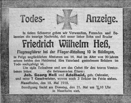 1918-04-24 Gefr. Mathias Hehle *30.04.1897 in Ravensburg (Württ), ist sechs Tage vor seinem 21.Geburtstag bei Stutttgart abgestürzt und verstarb am nächsten Tag.