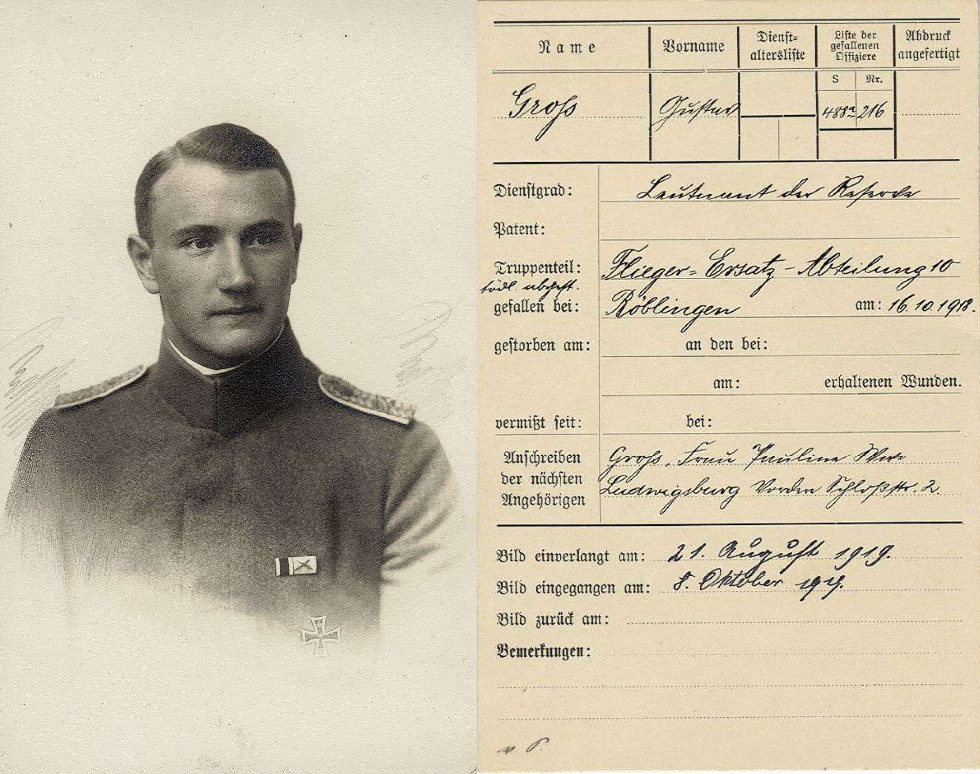 1918-10-16 Die Besatzung Fsch Uffz. Borstorf und Bsch Lt.d.R. Gustav Gross *18.03.1893 in Ludwigshafen (Württ), fliegen mit DFW C.V 413/18. Um ca. 15.30 Uhr stürzte Groß bei Sindelfingen aus dem Flugzeug. Borstorf landete glatt.