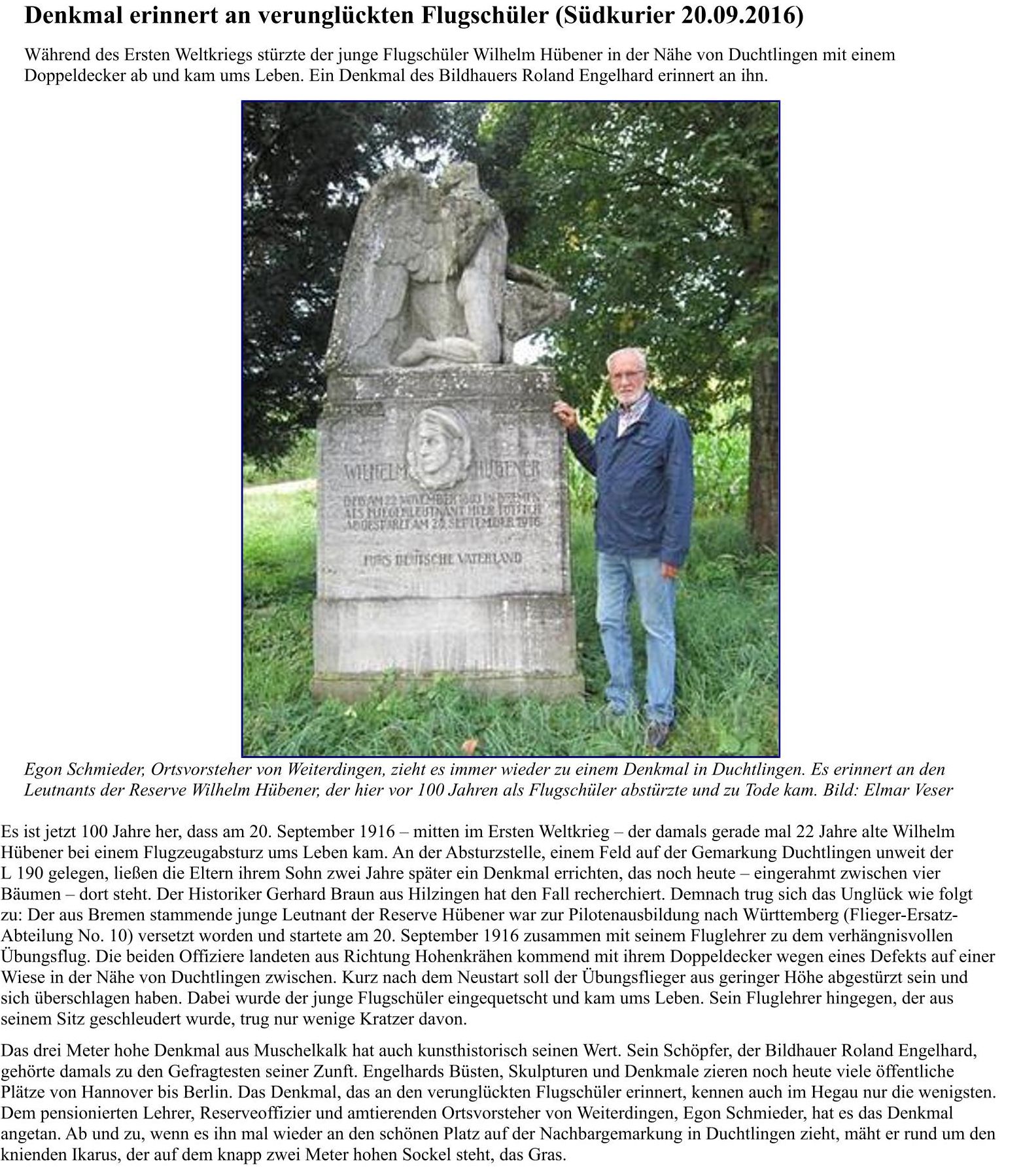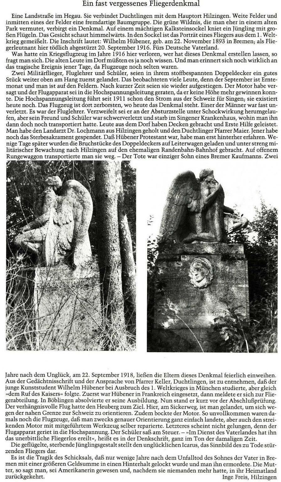1916-09-20 Die Besatzung Fsch Lt.d.R. Wilhelm Hübener *22.11 1893 in Bremen, und Fsch Lt. Obst ist mit Aviatik C.I 4466/15 in einer Kurve bei Duchtlingen abgerutscht. Dabei stirbt Hübener, Obst blieb unverletzt.