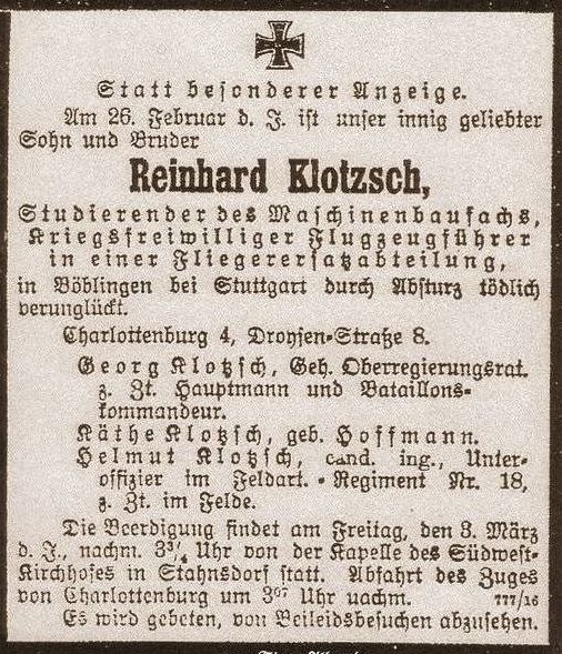 1916-02-19 Die Besatzung Fsch Flg. Reinhard Klotsch *05.1893 in Potsdam und Flg Uffz. Benno Dulk (Dütte ?) *Stuttgart, stürzte mit Alb. B.II 200/13 ab. Dulk wurde schwer verletzt. Klotzsch starb am 26.02.1916 und wurde auf dem Südwestfriedhof Stahnsdorf beigesetzt.