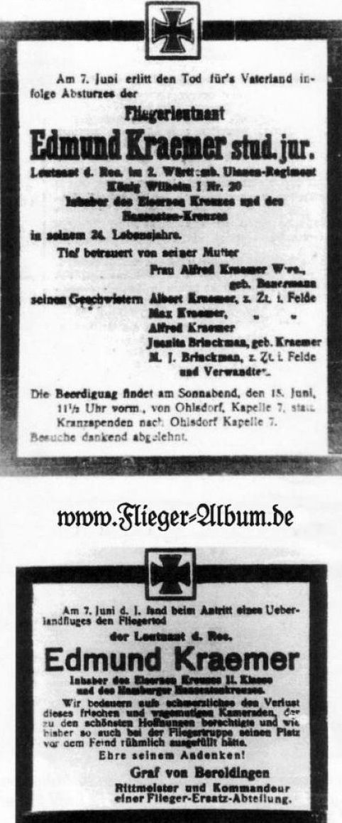 1918-06-07 Die Besatzung Fsch Lt.d.R. Edmund Kraemer *04.09 1894 in Hamburg, und Lt. Kretschmar stürzten mit DFW C.Vc C.17061/17 um 18.13 Uhr beim Antritt eines Überlandfluges über dem Friedhof Böblingen durch Überziehen in einer Rechtskurve tödlich ab.