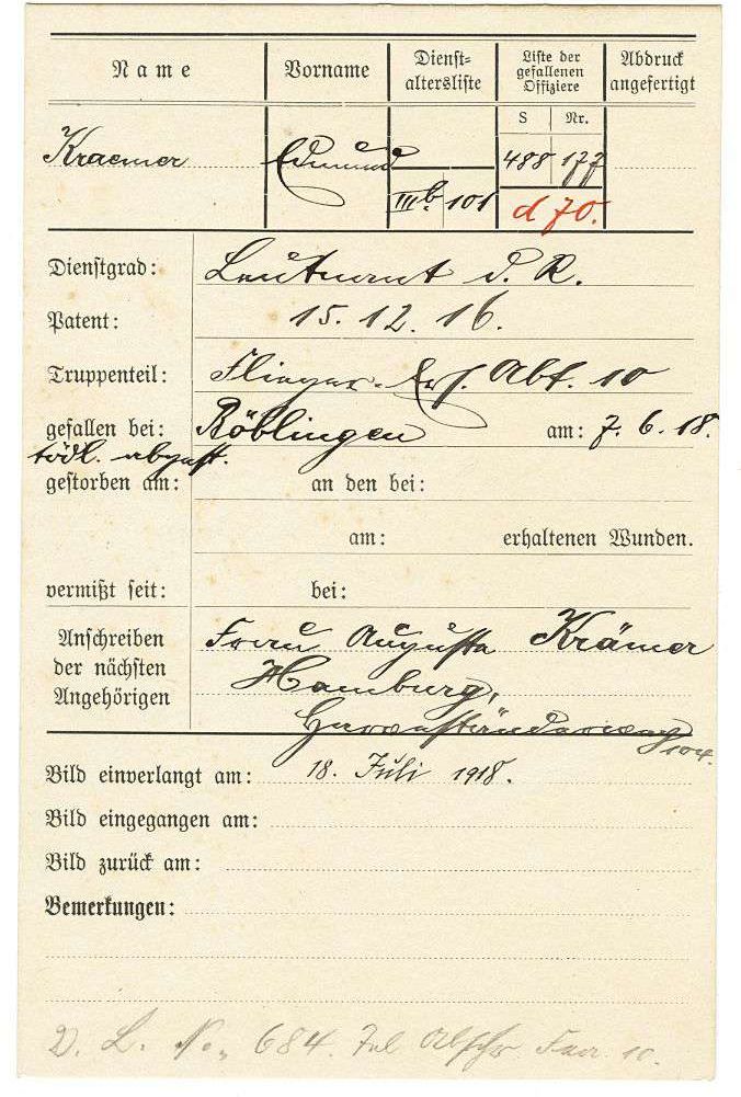 1918-06-29 Flg. Karl Eltrich *08.12.2892 in Ravensburg (Württ), starb im Krankenhaus Weingarten an einer Lungen-und Rippenfellentzündung.