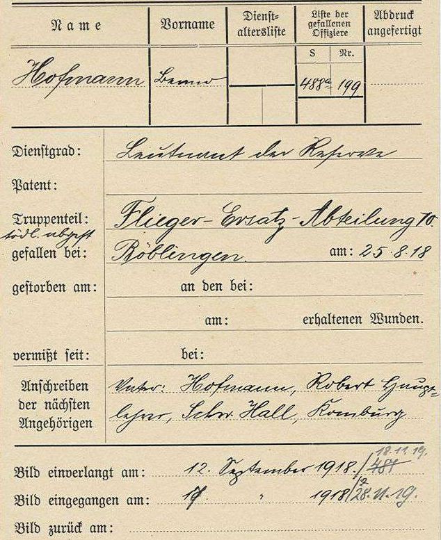 1918-08-25 Die Besatzung Fsch LT.d.R. Benno Hofmann *31.01.1895 in Degman (Württ), und B Lt.d.R. Matheis stürzten in DFW C.V 6115/17 um 10.30 Uhr am Banhof Böblingen in einer Rechtskurve ab. Matheis wurde dabei verletzt, Hofmann kam ums Leben.