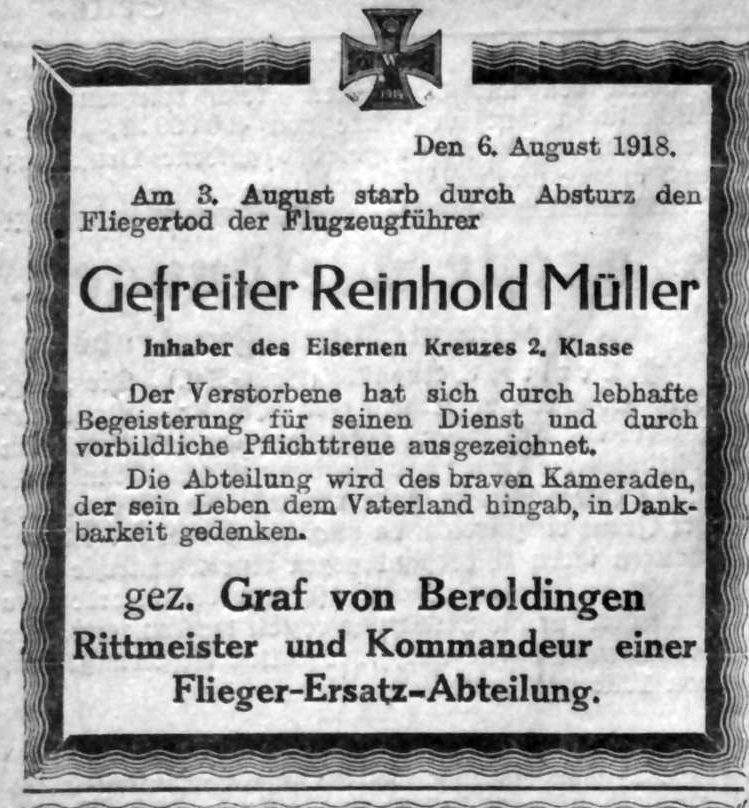 1918-08-03 Fesch Gefr. Reinhold Müller *06.11.1895 mit Albatros C.III (LVG) 1235/17, um 18.35 Uhr beim Bahnhof Böblingen durch Überziehen in der Kurve ab und kommt in den Flammen um, Müler wurde auf dem Friedhof in Heimsheim beigesetzt.