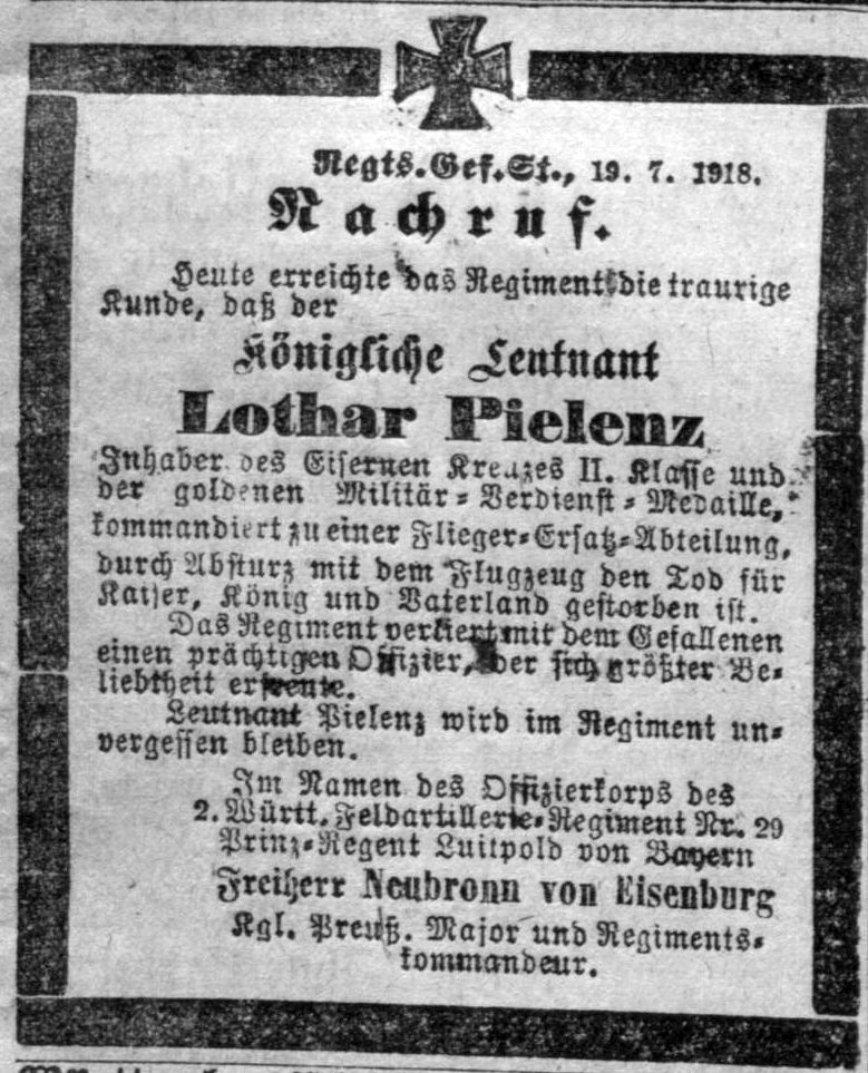 1918-07-16 Die Besatzung Lt. Lothar Pielenz *04.06.1895 in Heilbronn (Württ), und Fsch Flg. Friedrich Scheer *29.12.1897 in Ravensburg (Württ), stürzte mit LVG B.IIa (Schül) B.1422/17 um 16.15 Uhr aus unbekannter Ursache an der Straße Sindelfingen-Dagersheim tödlich ab.