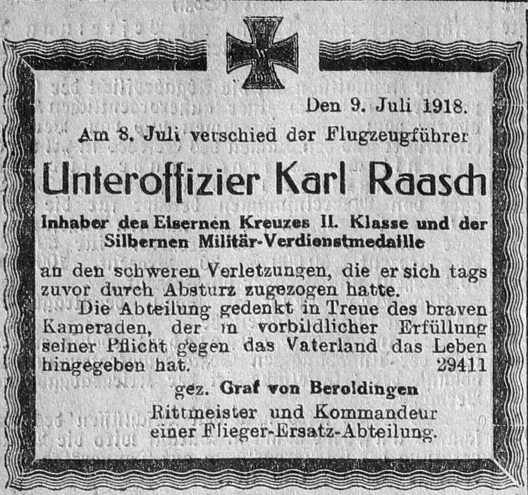 1918-07-07 Fsch Uffz. Karl Raasch *05.071895 in Stuttgart in LVG B.IIa (Schül) B.1496/17 stieß in 20 Meter Höhe mit Fsch Gefr. Class *05.07.1895 in Höfen (Württ), in Rumpler C.I (Mark 12929/17 über Böblingen zusammen. Class überlebte den Unfall verletzt, Raasch starb um nächsten Tag im Krankenhaus.
