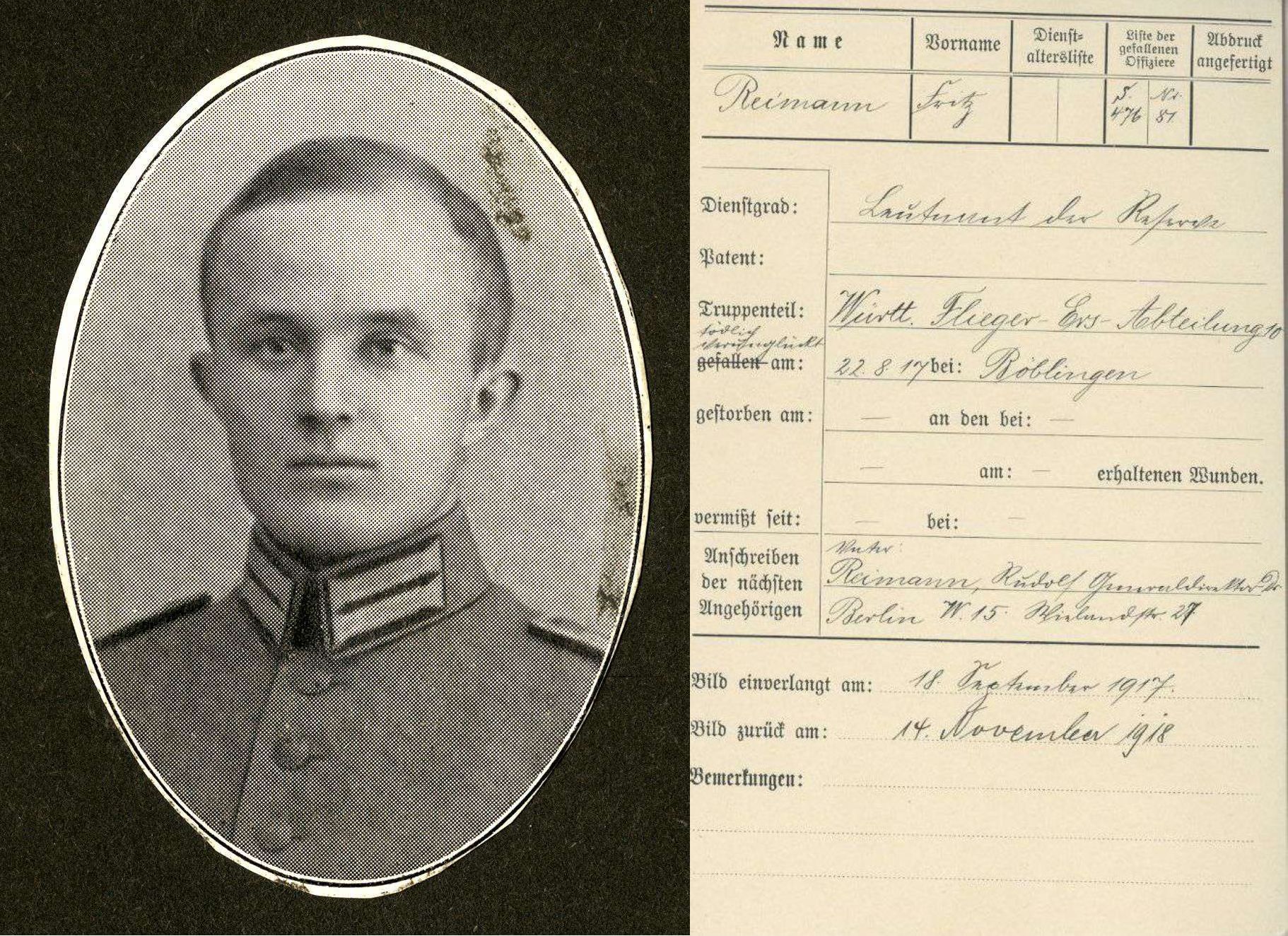 1917-08-22 Fsch Lt.d.R. Dr. Fritz Reimann *23.07.1896 in Schroda (Posen), wurde um 9.26 Uhr auf dem Flugplatz Böblingen durch die landende Aviatik C.I 1431/15 überrollt und starb um 13.15 Uhr im Krankenhaus Böblingen an den Unfallfolgen.