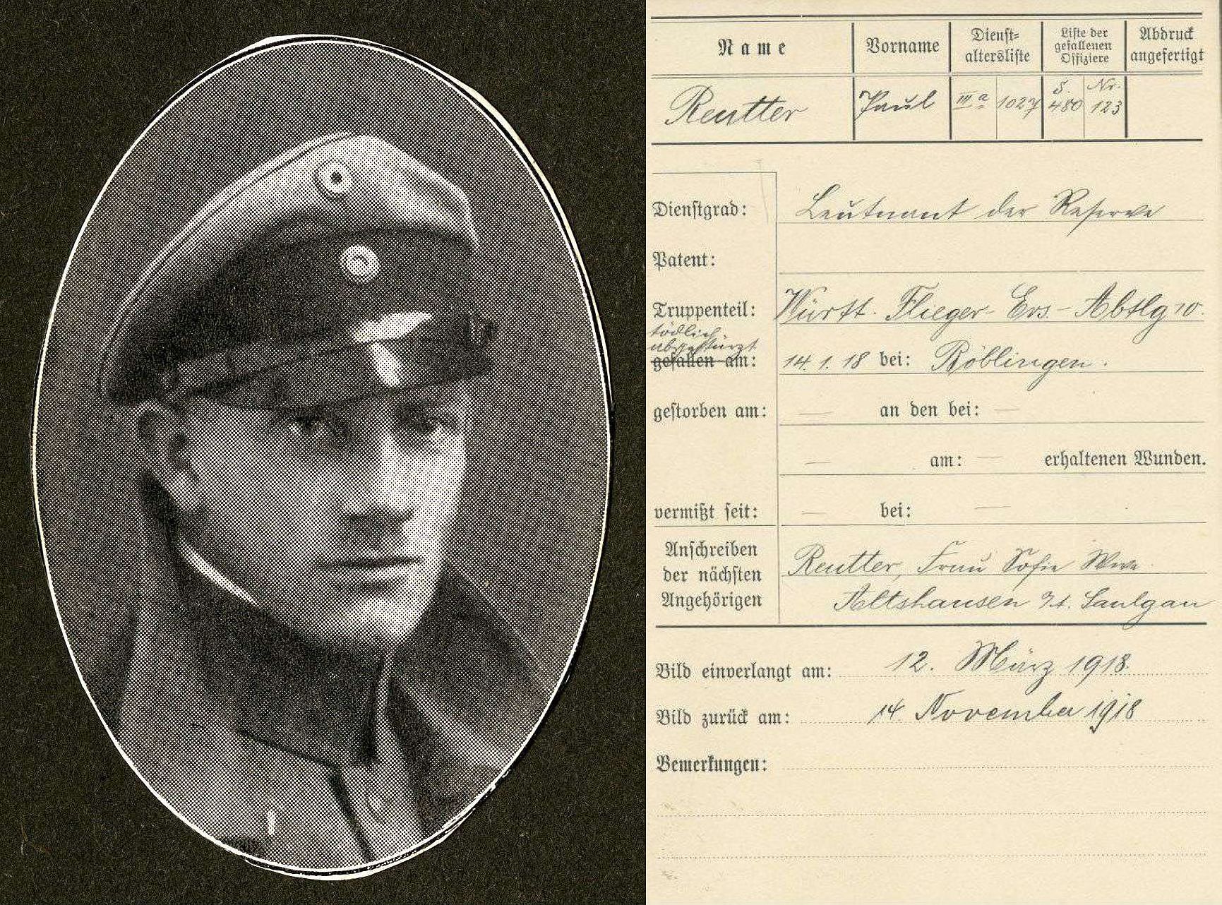 1918-01-14 Die Besatzung Fsch Lt.d.R. Paul Reuter *19.07.1897 in Althausen (Württ), und Fliegrschütze Gefr. Schollenberger geriet mit Rumpler C.I (Mark) C.5440/16 um 10.30 Uhr bei Goldbachtal ins Trudeln und stürzte ab. Schollenbergher war leicht verletzt, Reuter starb an den Unfallfolgen und wurde auf dem Friedhof in Altshausen beigesetzt.