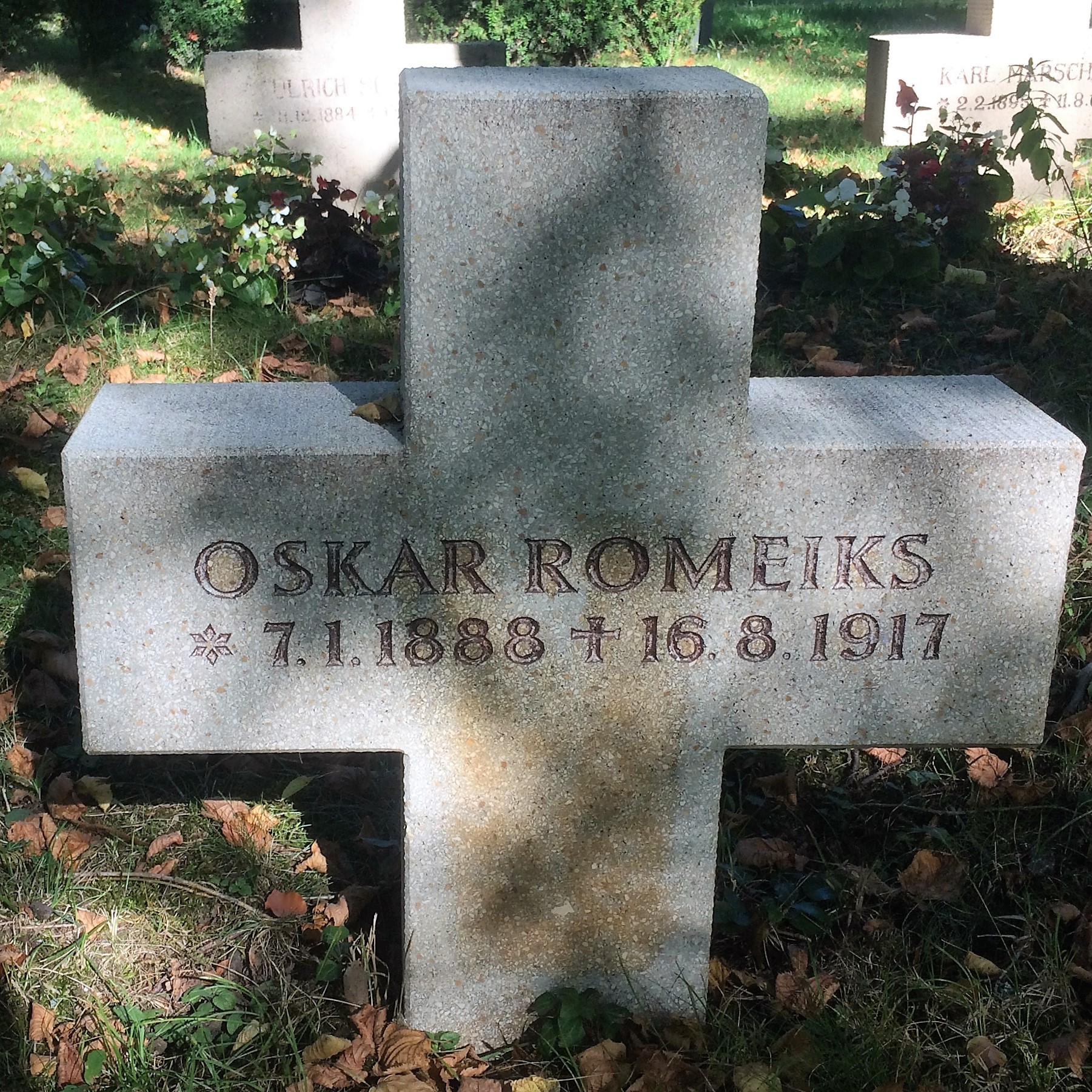 1917-08-16 Die Besatzung Fsch Vzfw. Reiter und FS Uffz. Oskar Romeiks *07.11 1888 in Hegenheim (Elsass-Lothringen), ist in Aviatik C.I (Han) 2773/16 an der Straße Böblingen-Dagersheim um 17.45 Uhr abgestürzt. Reiter wurde leicht verletzt, Romeiks starb.
