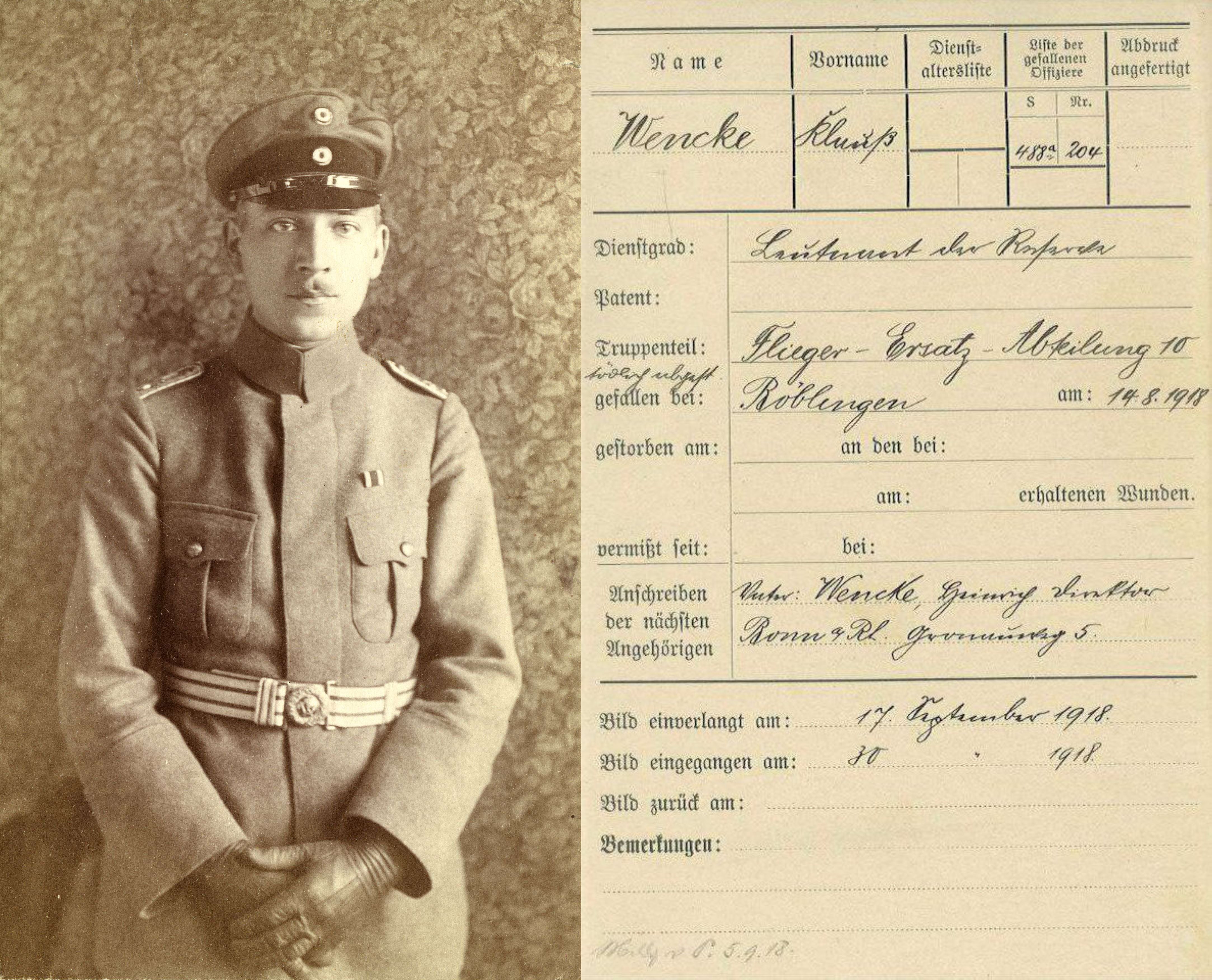 1918-08-14 Die Besatzung Fsch Gefr. Karl Schmidt *07.09.1896 in Züttlingen (Württ), ud B Lt.d.R. Klaus Wencke *04.01.1894 in Blumenthal (Hannover), stürzten mit DFW C.V 7764/17 um 9.10 Uhr in einer Kurve aus 50 m Höhe ab und kommt dabei ums Leben.
