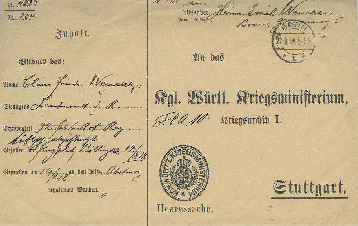 1918-08-07 Die Besatzung Fsch Gefr. Wilhelm Schnurr *03.03.1894 in Langenau (Württ), und Bsch Lt.d.R. Otto Baumann *05.04.1894 in Markgröningen (Württ), stürzten in Hannover CL.II (Rol) 509/18 um 8.30 Uhr bei Zuffenhausen ab. Beide Besatzungsmitglieder starben. Baumann wurde nach Markgröningen überführt.