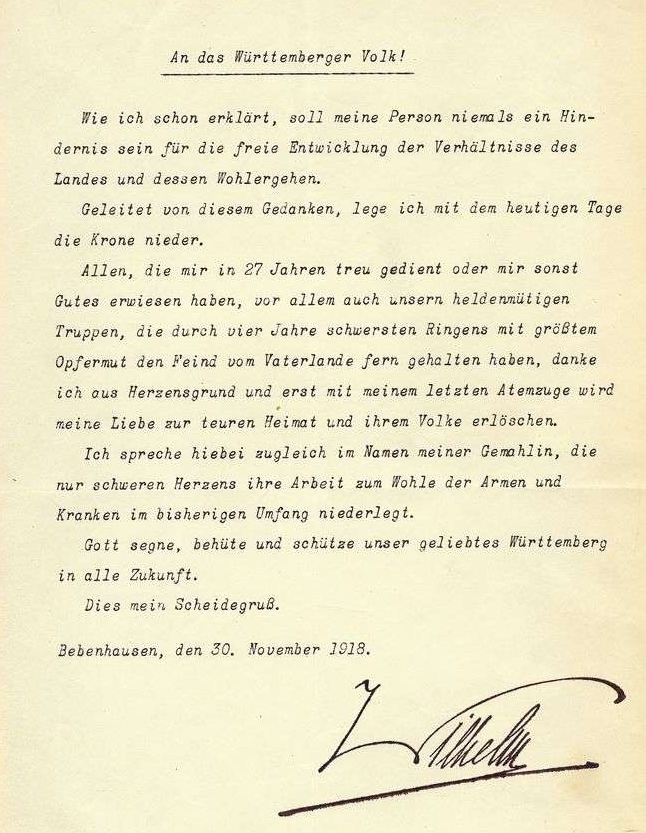 Zehn Monate später war der WKI zu Ende und König Wilhelm II. von Württemberg dankte ab.