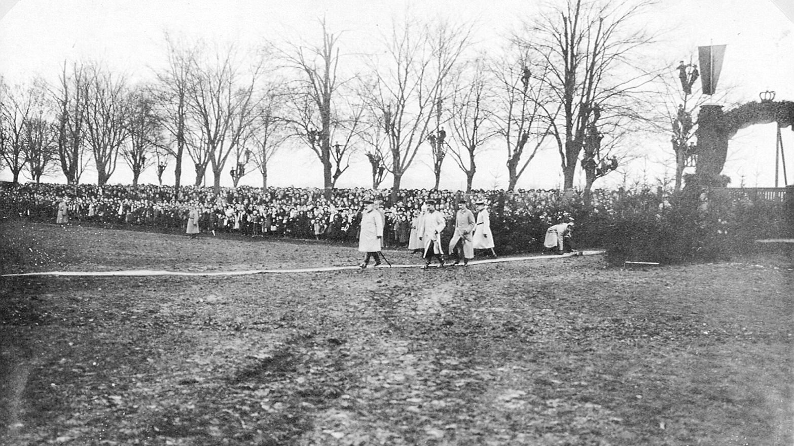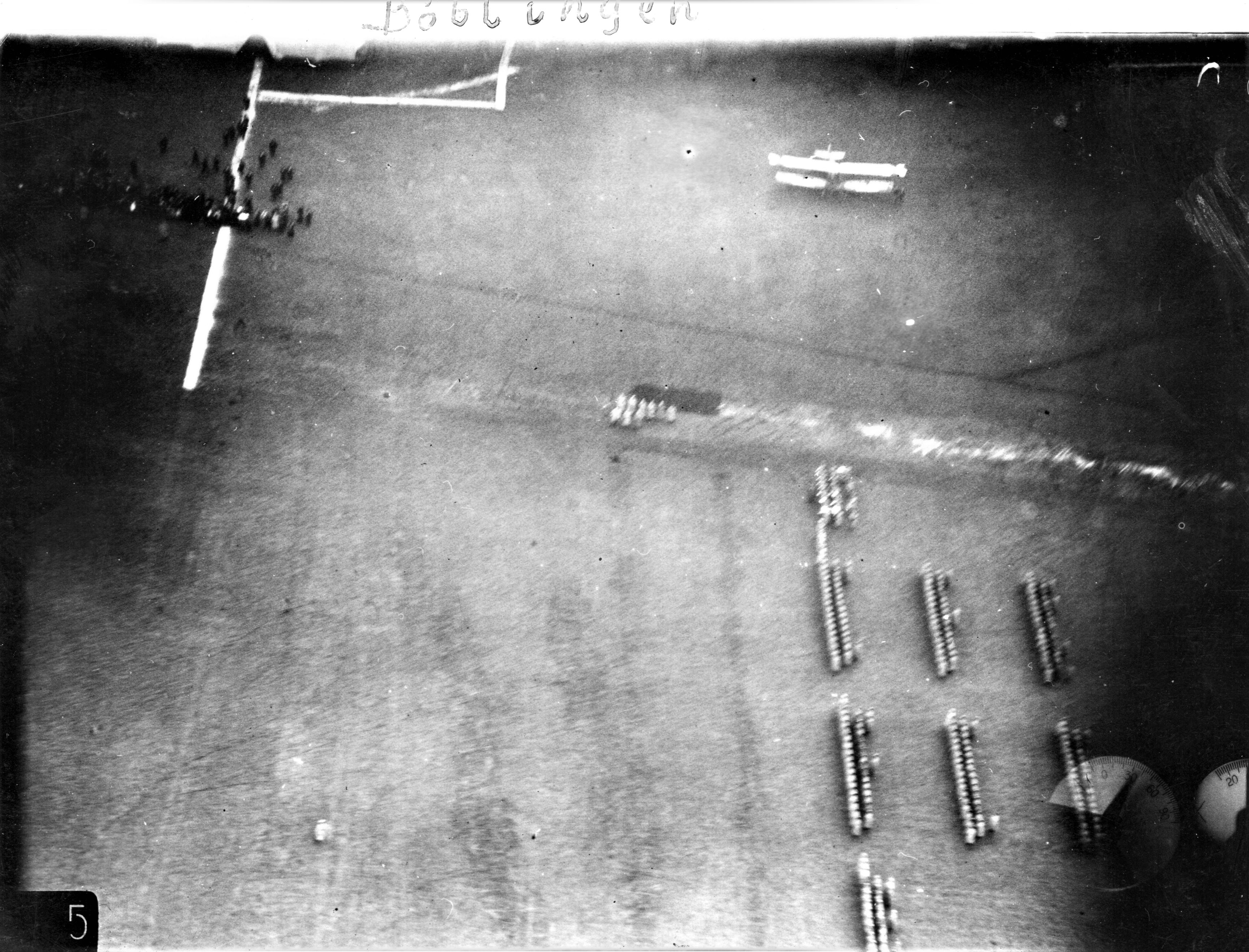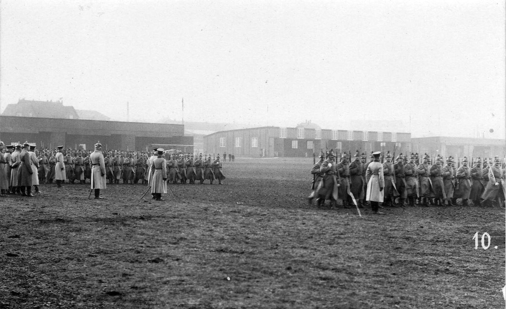 Die ganze Stadt hatte Blumenschmuck angelegt und war in Bewegung. Die Schuljugend bekam frei und nahm Aufstellung in der Sindelfinger Straße. Zum Besuch des Übungsplatzes war eine beschränkte Zahl von Einladungskarten ausgegeben worden. Um 11.00 kam der König unter Hurrarufen, Glockengeläute und Böllerschüssen, begleitet vom Kriegsminister von Marchtaler und einigen höheren Offizieren, im Auto an und begab sich durch die mit der württembergischen Krone gezierte und mit Flaggen reich geschmückte Ehrenpforte auf den Übungsplatz. Nach dem Abschreiten der in Kompaniefront aufgestellten Mannschaften unter Befehl von Hauptmann Ruff, wurde der Parademarsch in Zügen abgenommen. Die von Musikmeister Maschke gegründete Kapelle der Fea 10 begleitete den königlichen Besuch. Zu gleicher Zeit fanden größere technische Übungen statt, die der König mit starkem Interesse verfolgte. Der Führer der Abteilung, Hptm. von Beers, zeigte dem König mit seinem Gefolge die Einrichtungen des Flugplatzes sowie den Flugbetrieb. Nach Schluss der Besichtigung war der König noch in lebhafter Unterhaltung im Kasino, bis er wieder seine Rückfahrt nach Stuttgart antrat.