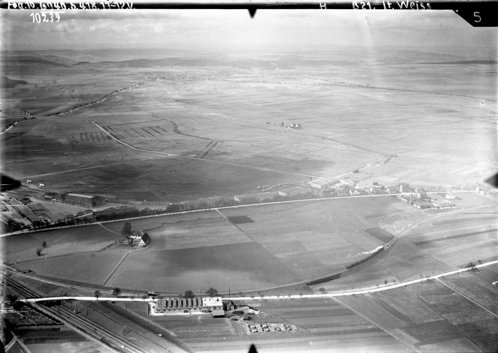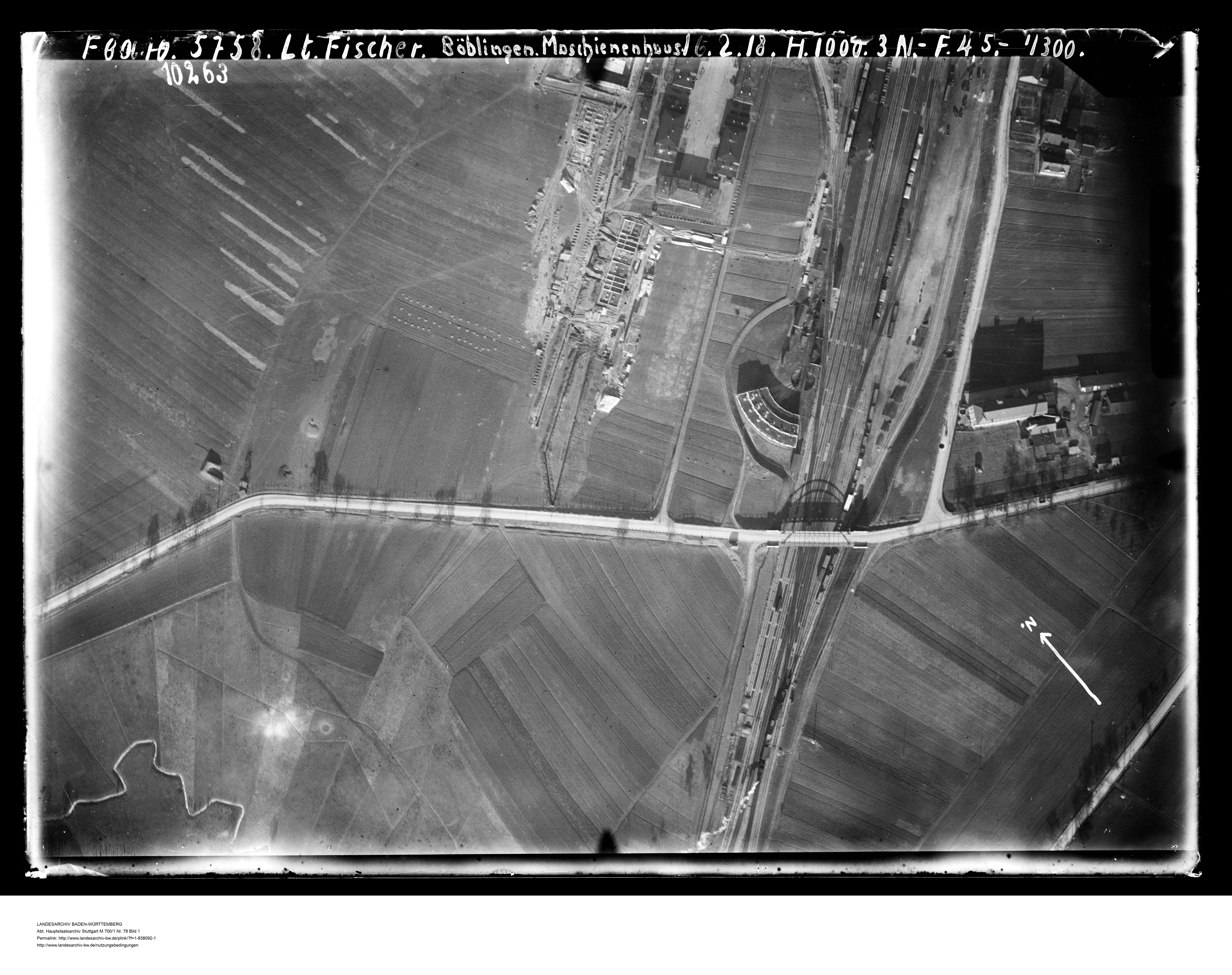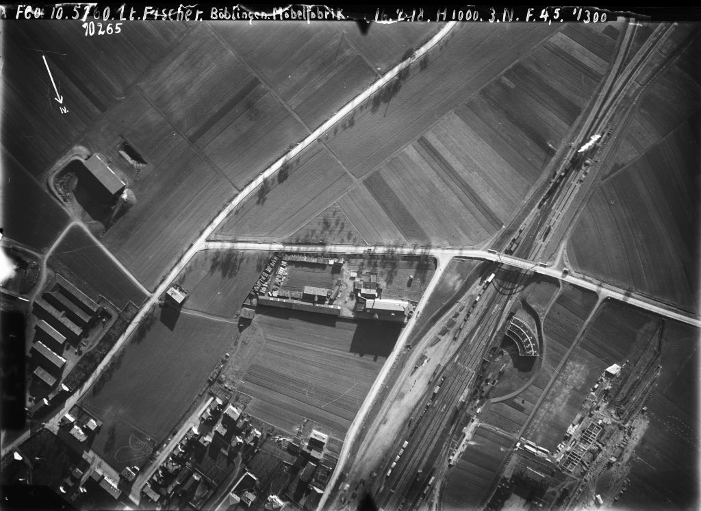 1918-05-30 links oben Flugplatz – Gebäude im Rohbau – links unten Dagersheimer Straße – darüber von rechts Möbelfabrik Renz, Ringlokschuppen (Quelle)