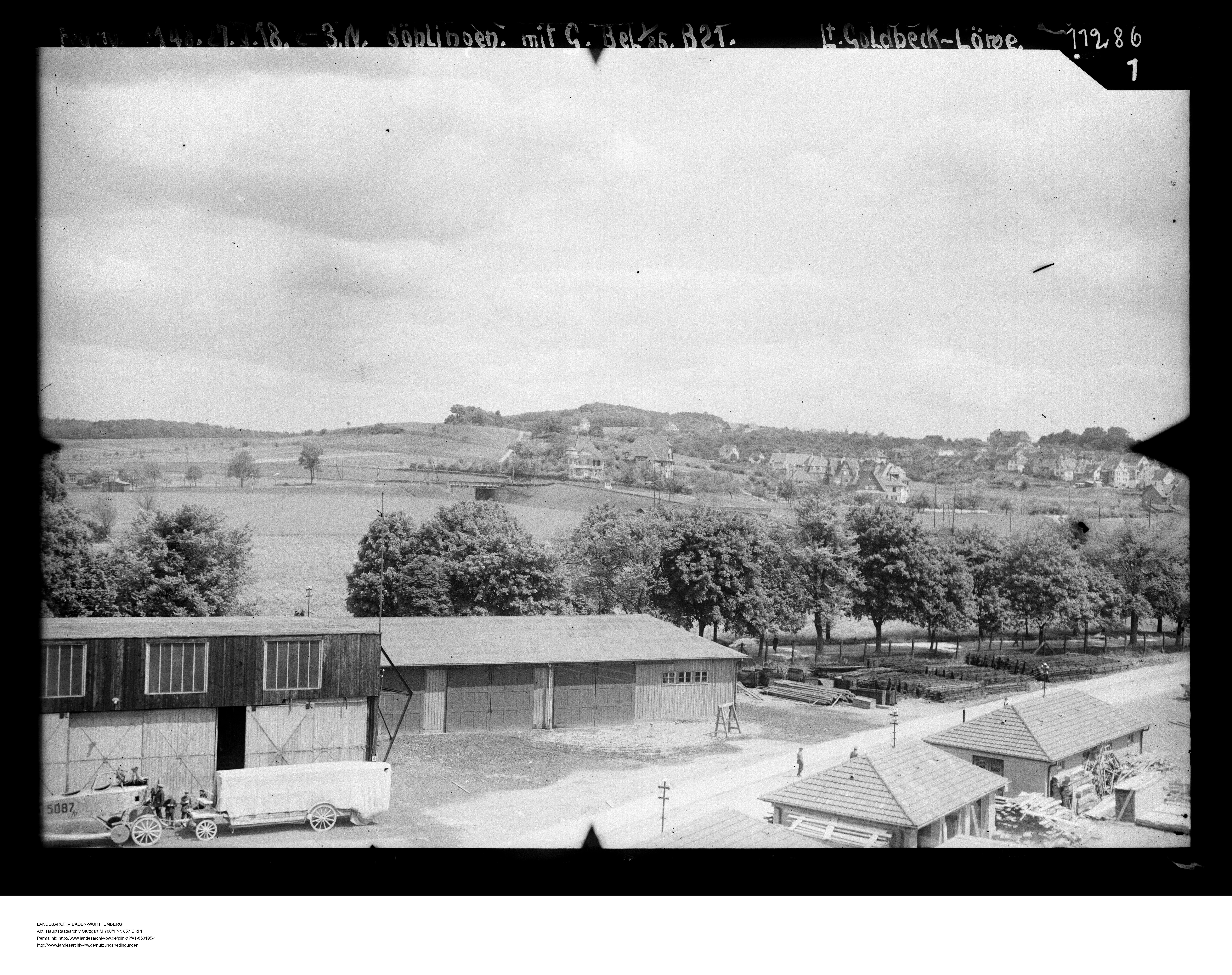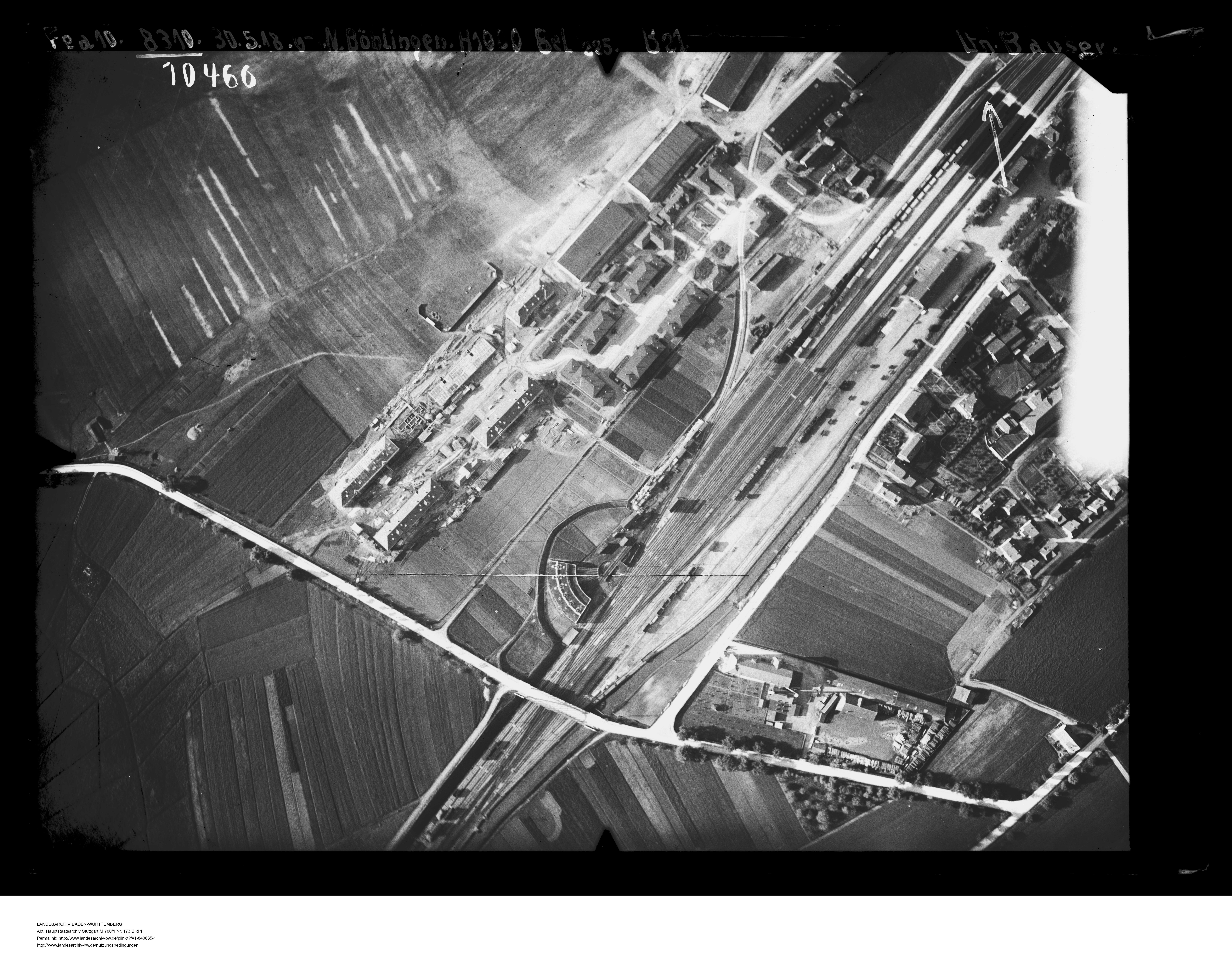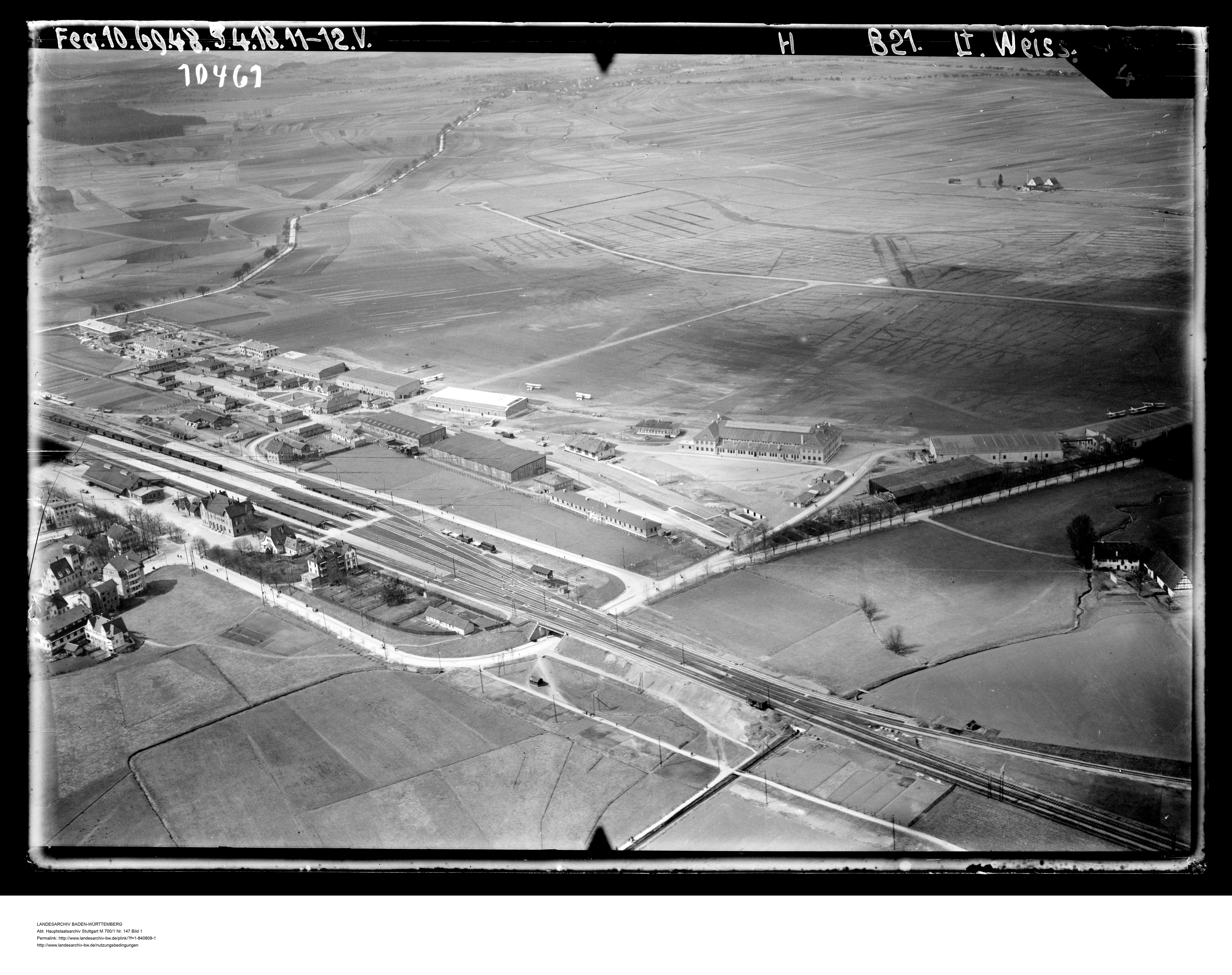 1918-05-30 links oben Flugplatz – Gebäude im Rohbau – links unten Dagersheimer Straße – darüber von rechts Möbelfabrik Renz, Ringlokschuppen (Quelle)