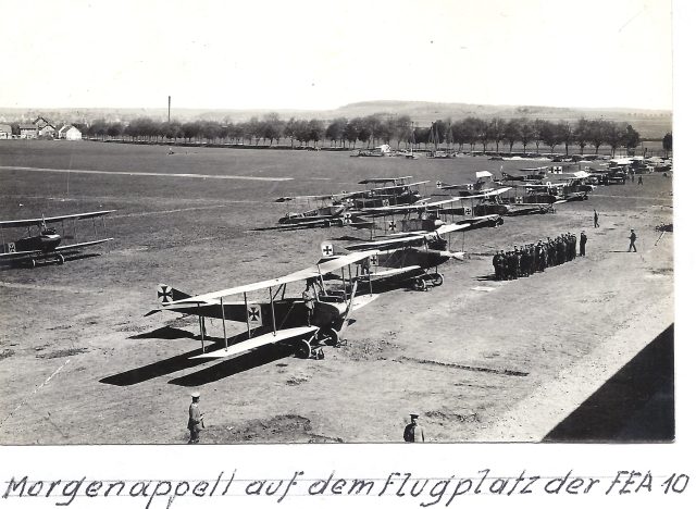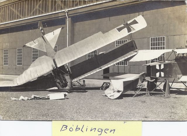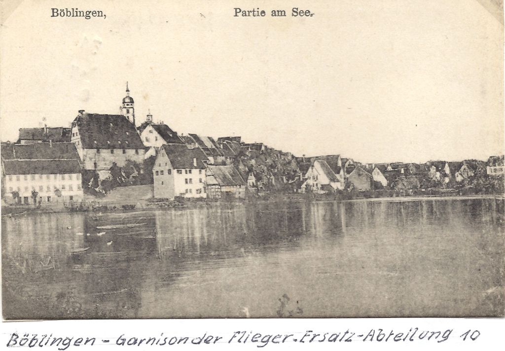 Zusammen mit dem Gesellenbrief am Ende meiner Lehrzeit (01.10.1916) erhielt ich den Einberufungsbefehl zur Flieger-Ersatz-Abteilung (FEA) 10 nach Böblingen. Diese Abteilung war erst im Verlauf des Krieges aufgezogen worden und war in einem Barackenlager zwischen Böblingen und Sindelfingen stationiert. Deshalb war die Unterbringung sehr primitiv. Waschen musste man sich an einem Wasserhahn auf der Straße, der aber im Winter meist zugefroren war. Die Plumps-Closetts lagen etwa 50m entfernt in einem Sonderbau. Wer zur Winterszeit mal „raus“ musste in der Nacht, der hatte sich oft bei großer Kälte durch tiefen Schnee hindurch zu kämpfen. „Abkürzungen“ wurden dadurch unterbunden, dass wir selbst während der Nachtzeit eine Wache als Aufsicht stellen mussten. Besondere Erkrankungen gab es trotz der primitiven Umstände keine. Am Ende dieses Lagers standen die Flugzeugschuppen an die sich dann der eigentliche Flugplatz anschloss.