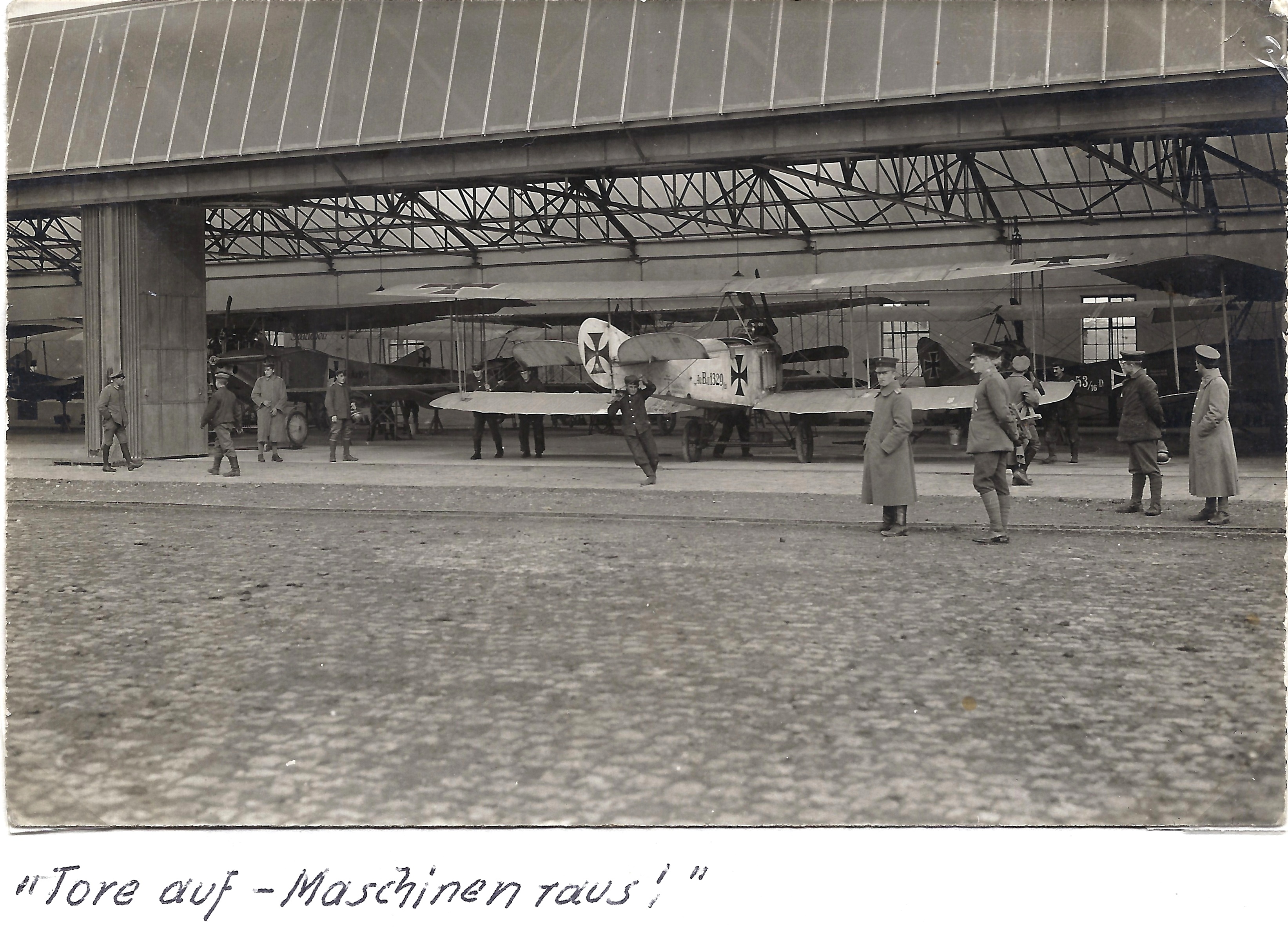 Zusammen mit dem Gesellenbrief am Ende meiner Lehrzeit (01.10.1916) erhielt ich den Einberufungsbefehl zur Flieger-Ersatz-Abteilung (FEA) 10 nach Böblingen. Diese Abteilung war erst im Verlauf des Krieges aufgezogen worden und war in einem Barackenlager zwischen Böblingen und Sindelfingen stationiert. Deshalb war die Unterbringung sehr primitiv. Waschen musste man sich an einem Wasserhahn auf der Straße, der aber im Winter meist zugefroren war. Die Plumps-Closetts lagen etwa 50m entfernt in einem Sonderbau. Wer zur Winterszeit mal „raus“ musste in der Nacht, der hatte sich oft bei großer Kälte durch tiefen Schnee hindurch zu kämpfen. „Abkürzungen“ wurden dadurch unterbunden, dass wir selbst während der Nachtzeit eine Wache als Aufsicht stellen mussten. Besondere Erkrankungen gab es trotz der primitiven Umstände keine. Am Ende dieses Lagers standen die Flugzeugschuppen an die sich dann der eigentliche Flugplatz anschloss.