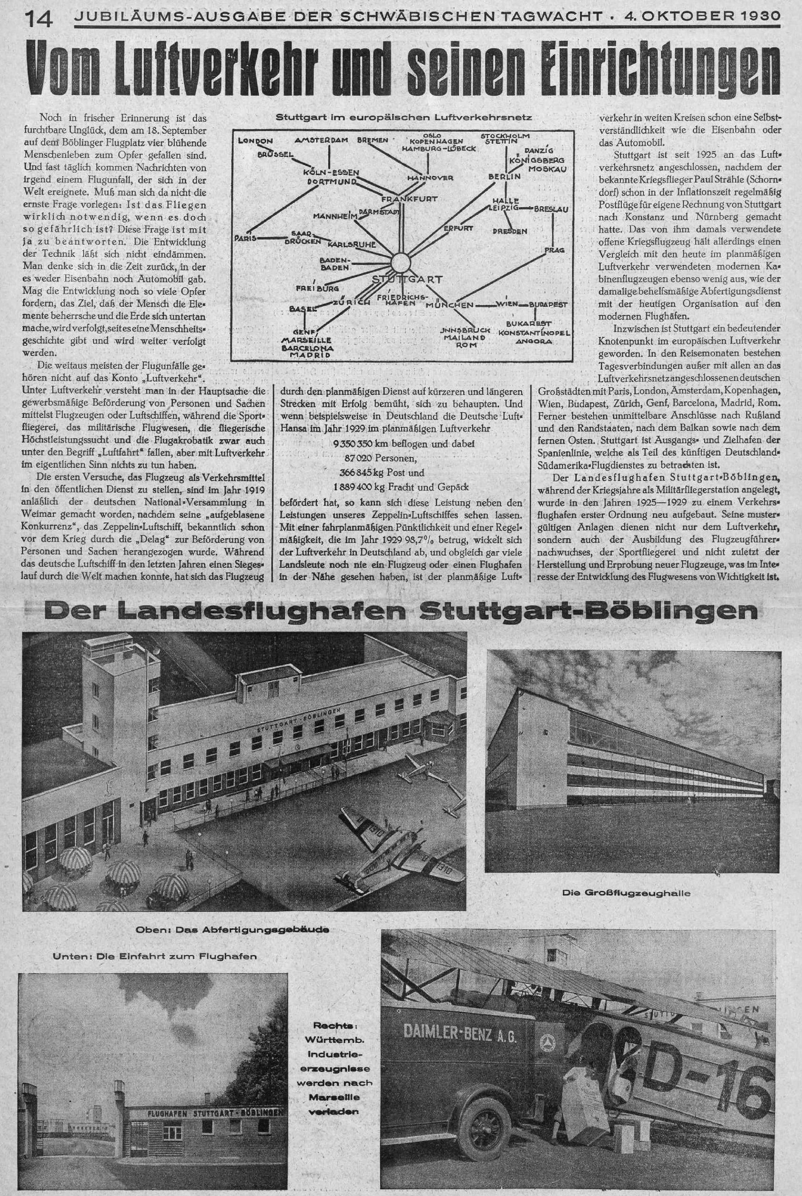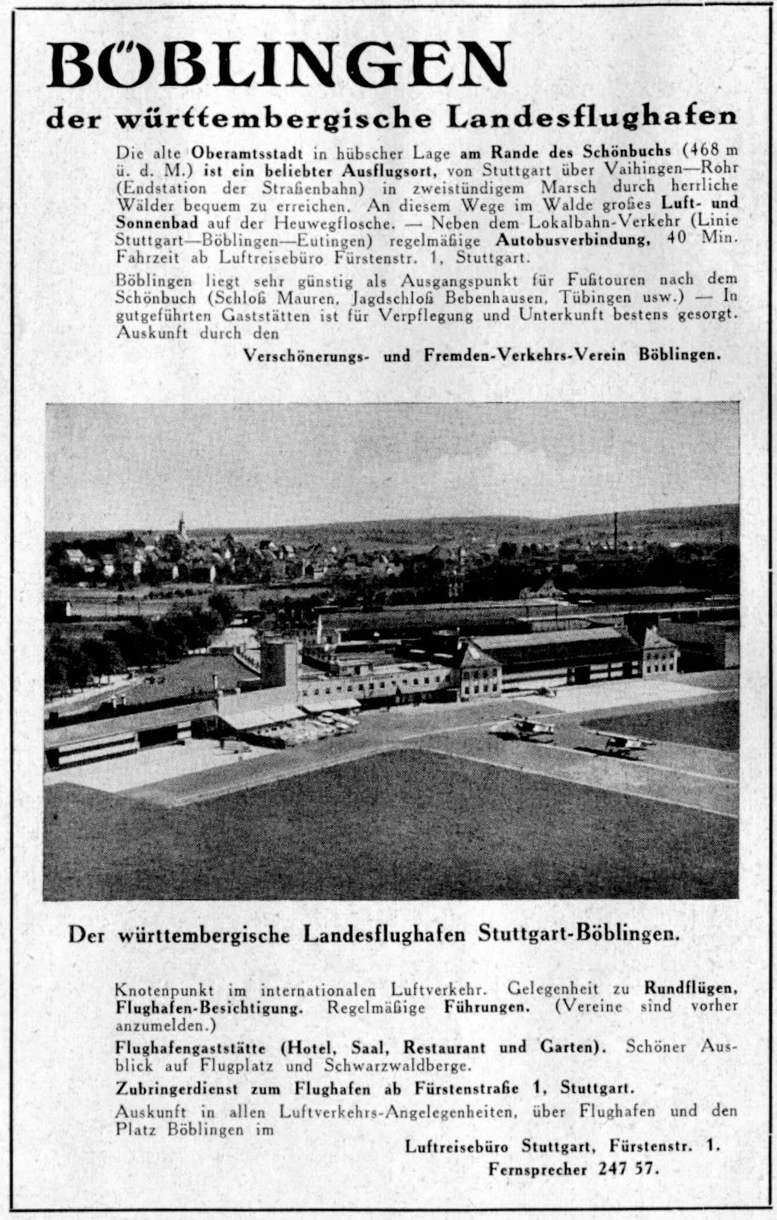• 1919 bis 1925 Überlegungen, wie der ehemalige Militärflugplatz nach dem Ende des Ersten Weltkrieg wieder genutzt werden kann. 15.11.1924 – Gründung der Luftverkehr Württemberg A.G. (LUWAG)