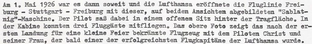 In einem Bericht aus einem Fotoalbum des Stadtarchivs Freiburgs wird der 1. Mai 1926 als Eröffnung der Fluglinie Freiburg – Stuttgart – Freiburg genannt.