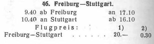 City-Flughafens Freiburg. (Stuttgart steht zu dieser Zeit für Böblingen) „Bereits am 3. Juli 1926 wurde die regelmäßige Fluglinie Freiburg-Stuttgart eröffnet. Die Maschinen flogen in Freiburg um 11.40 Uhr ab und landeten in Stuttgart-Böblingen um 12.50 Uhr. Der Rückflug ging ab Stuttgart 13.10, an Freiburg 14.20. Die Werbung für die Fluglinie nach Stuttgart wurde sehr intensiv und attraktiv betrieben. Die Gegenüberstellung der Flugdauer mit der Eisenbahnfahrt erbrachte eine Differenz von über 3 Stunden Zeitgewinn zugunsten der Fluglinie. Demgegenüber stand lediglich ein um 4,60 DM höherer Flugpreis. Der Flugpreis betrug RM 25.-, während eine Eisenbahnfahrkarte 2. Klasse zu jener Zeit RM 22.40 kostete. Vor allen Dingen wurden die Anschlussflüge nach Erfurt, Halle, Berlin, Nürnberg“