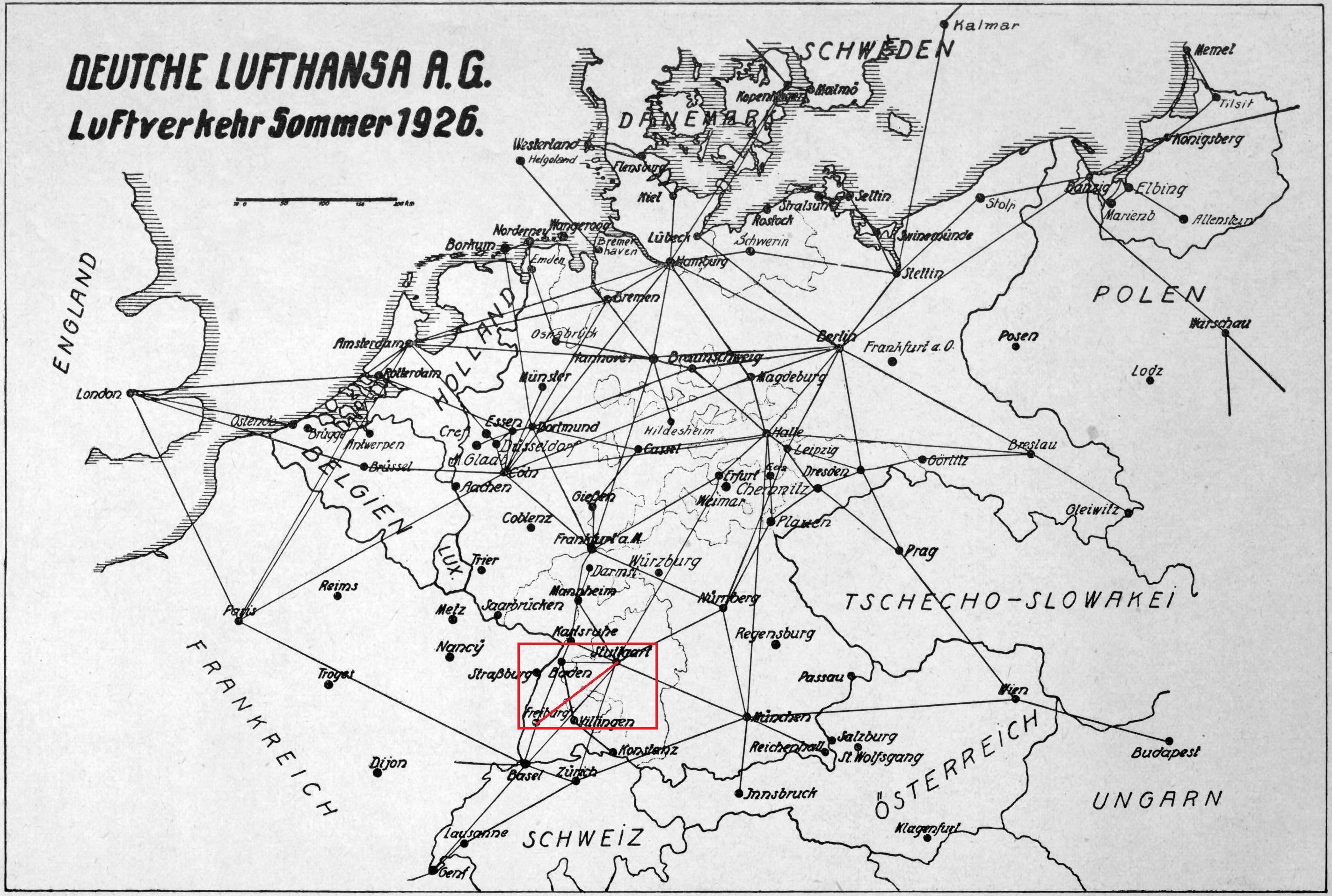 „Am gleichen Tage, als Innenminister Remmele seinen Brief in Karlsruhe schrieb, beschloss der Bürgerausschuss mit überwältigender Mehrheit, den Anschluss Freiburgs an den Weltluftverkehr durch eine Linie Freiburg-Stuttgart, evtl. mit einer Verlängerung nach Basel, zu suchen.“
